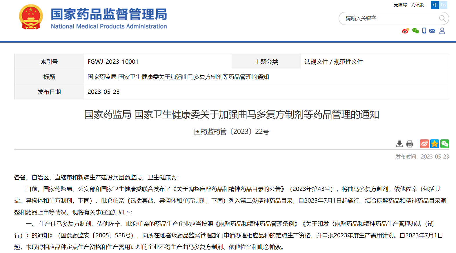 國家藥監(jiān)局 國家衛(wèi)生健康委關(guān)于加強曲馬多復(fù)方制劑等藥品管理的通知