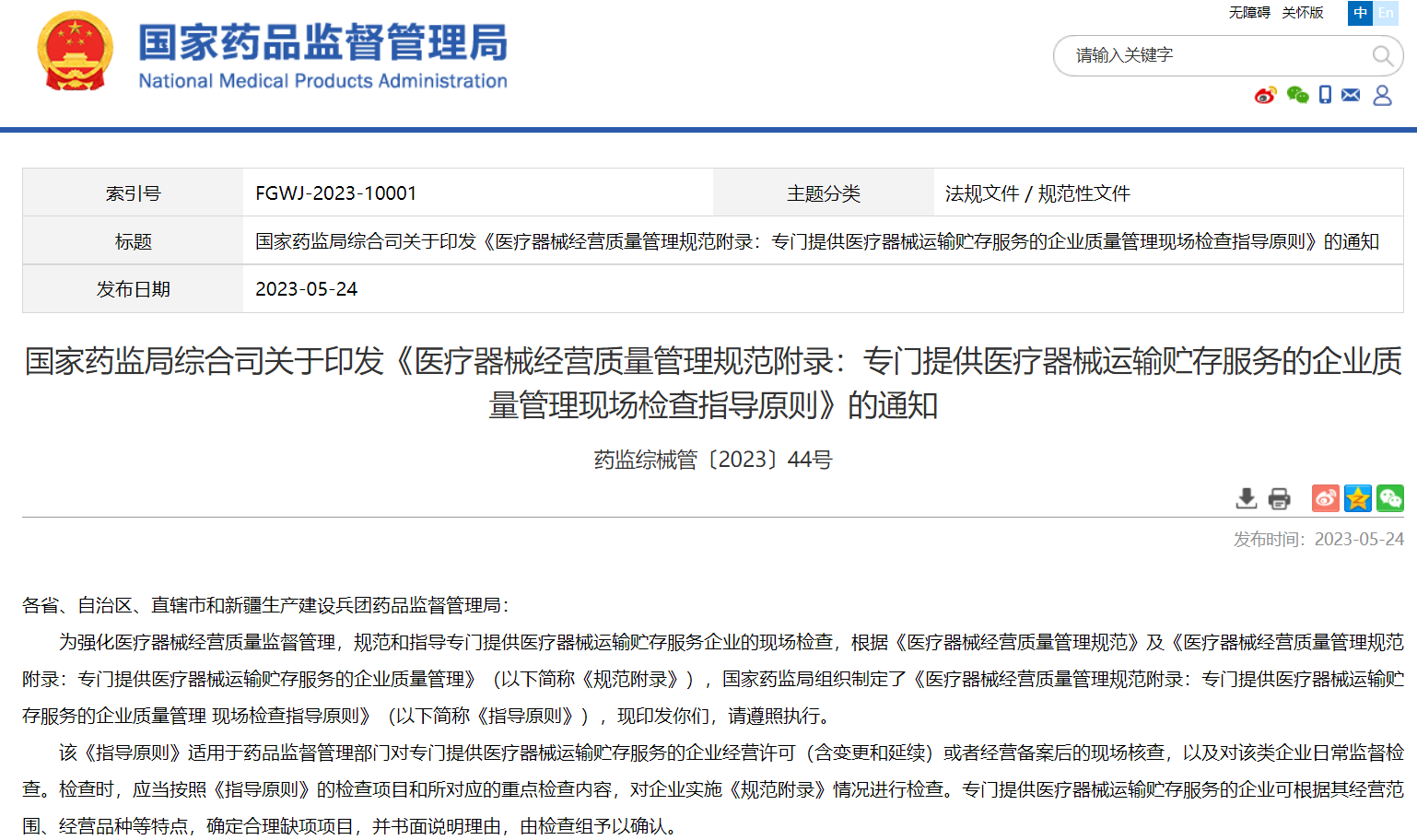 國家藥監(jiān)局綜合司關(guān)于印發(fā)《醫(yī)療器械經(jīng)營質(zhì)量管理規(guī)范附錄:專門提供醫(yī)療器械運輸貯存服務(wù)的企業(yè)質(zhì)量管理現(xiàn)場檢查指導(dǎo)原則》的通知