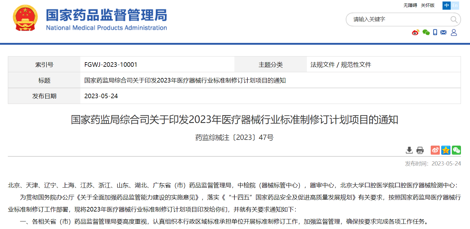 國家藥監(jiān)局綜合司關(guān)于印發(fā)2023年醫(yī)療器械行業(yè)標(biāo)準(zhǔn)制修訂計劃項目的通知