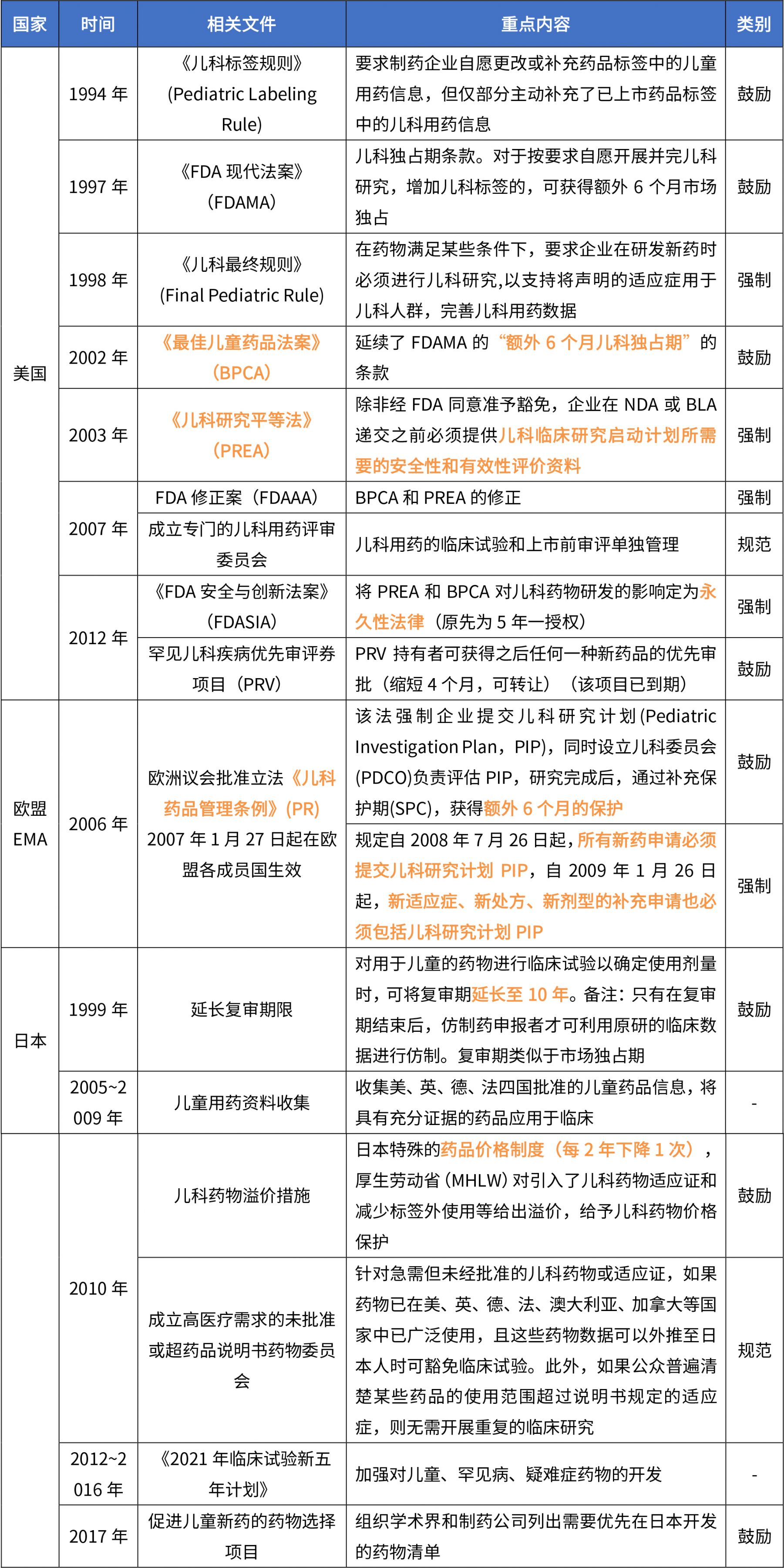 歐美日是兒科用藥政策先行者,美國、歐盟都具有專門的的兒童用藥立法,采用鼓勵(lì)+強(qiáng)制結(jié)合的協(xié)同策略促進(jìn)兒童新藥的開發(fā)、兒童臨床試驗(yàn)的管理等。日本也通過制定各種法規(guī)來鼓勵(lì)規(guī)兒藥開發(fā)。各國項(xiàng)目兒藥法規(guī)內(nèi)容見下表。