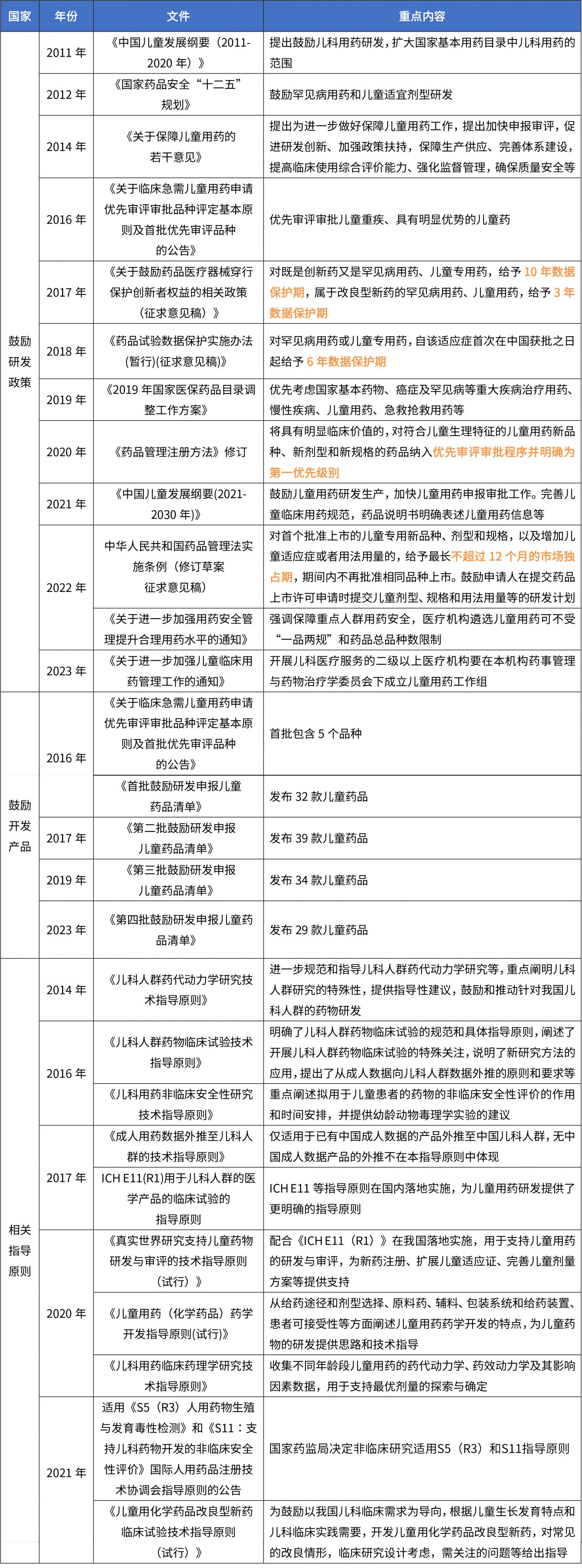在我國,為鼓勵(lì)國內(nèi)藥企加大兒童藥的研發(fā)和生產(chǎn),近年來,政府部門陸續(xù)出臺(tái)了一系列相關(guān)政策,包括鼓勵(lì)研發(fā)、優(yōu)先評(píng)審、加強(qiáng)醫(yī)院配備、招標(biāo)采購直接掛網(wǎng)等,部分法規(guī)詳見下表。