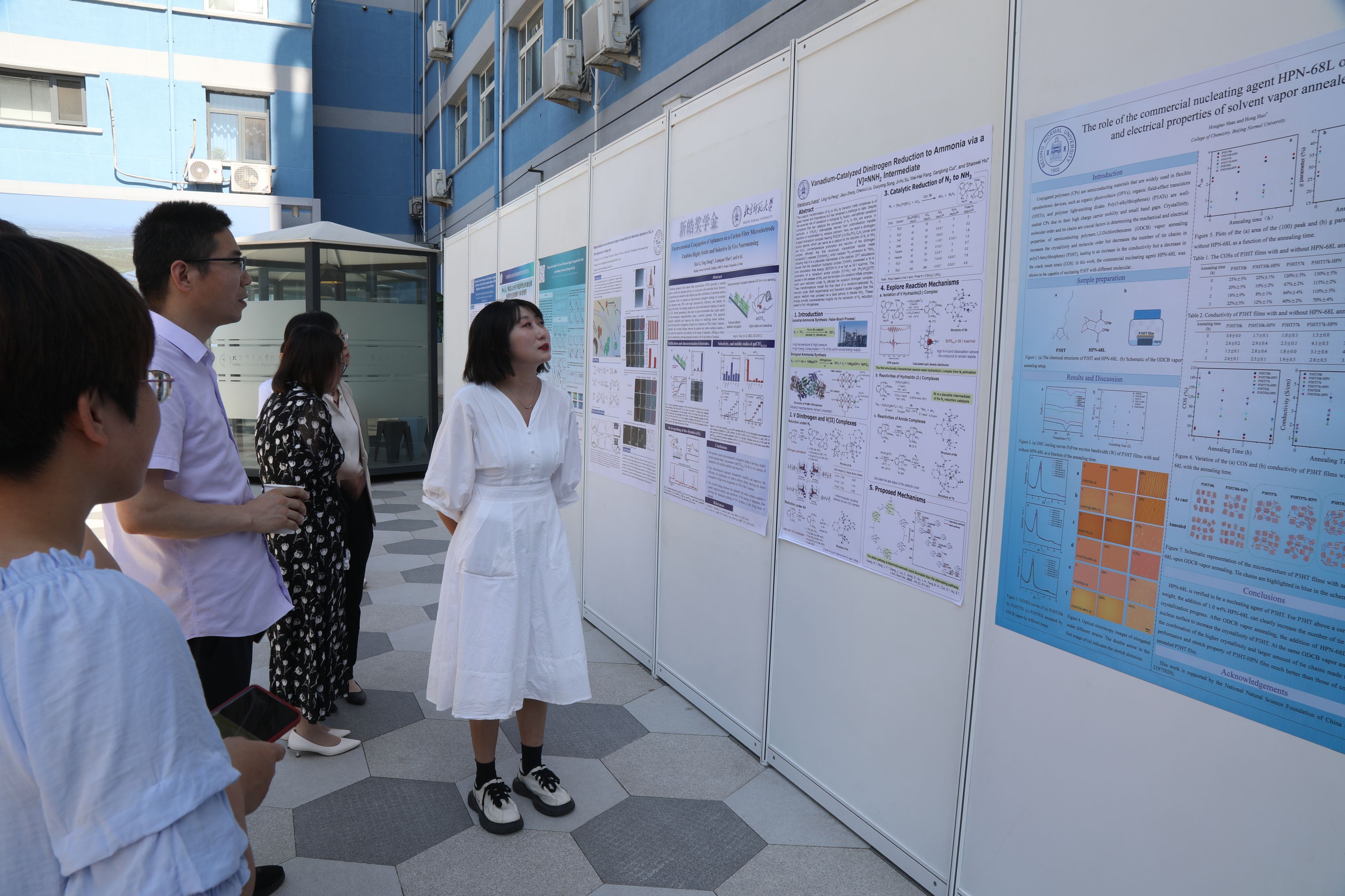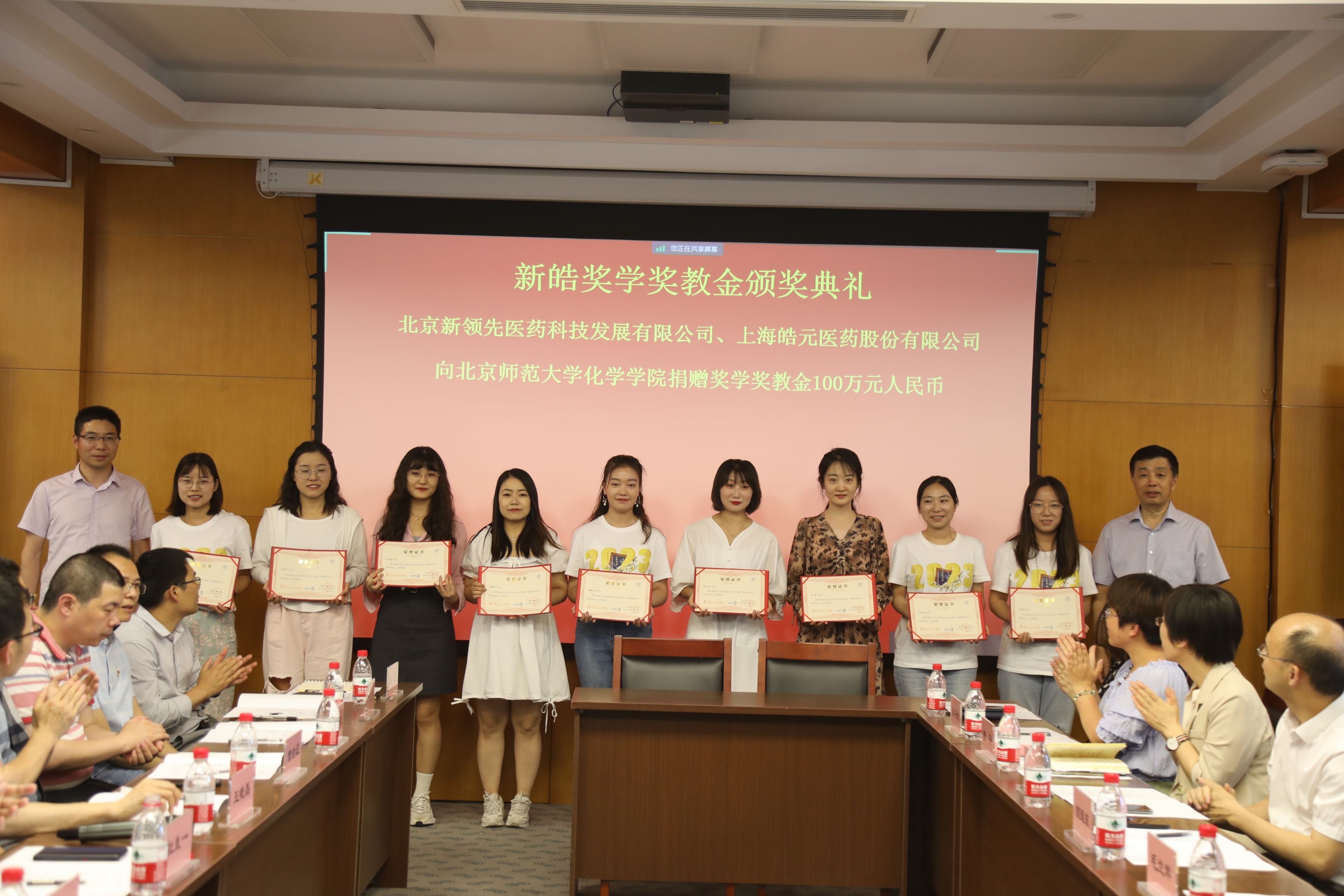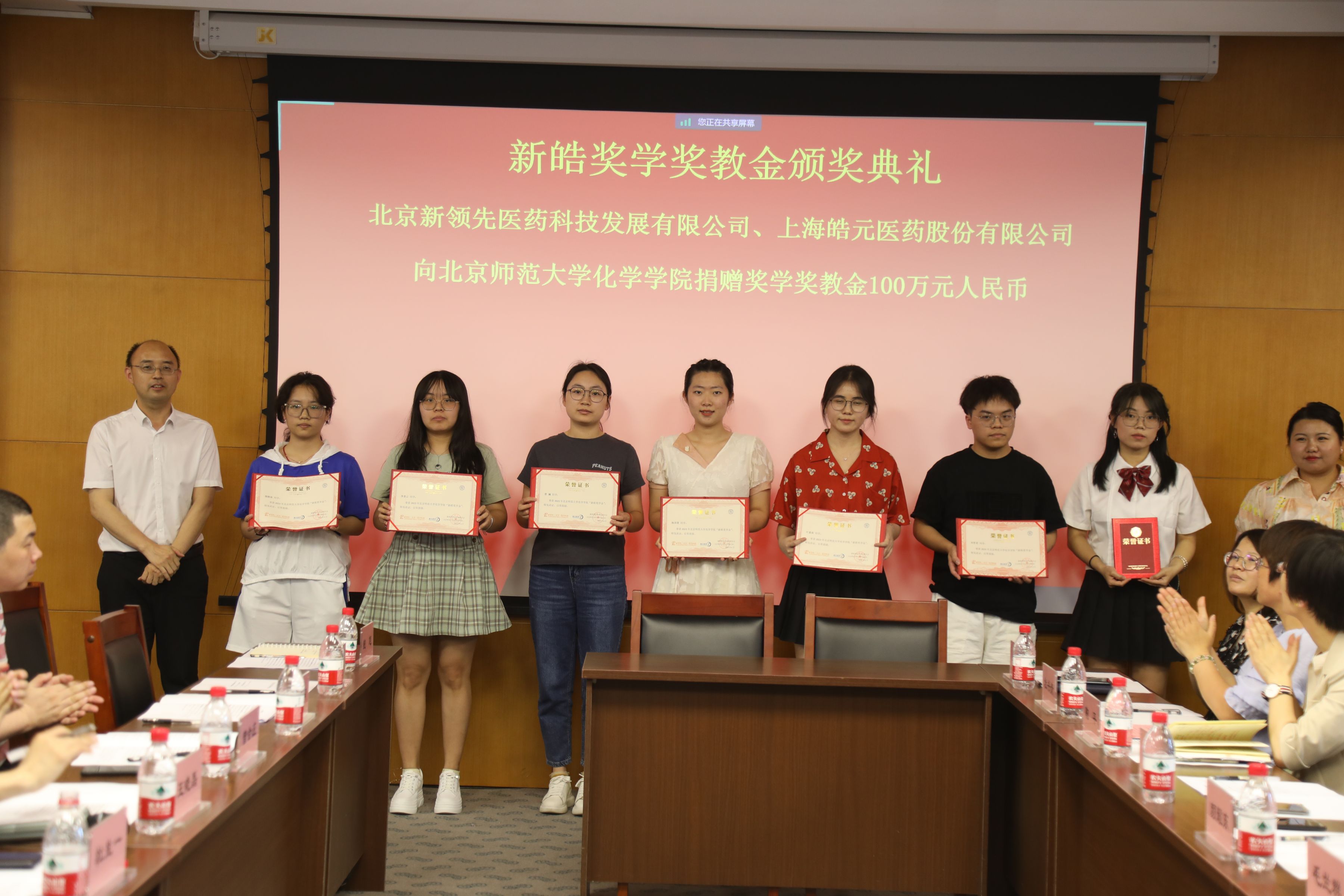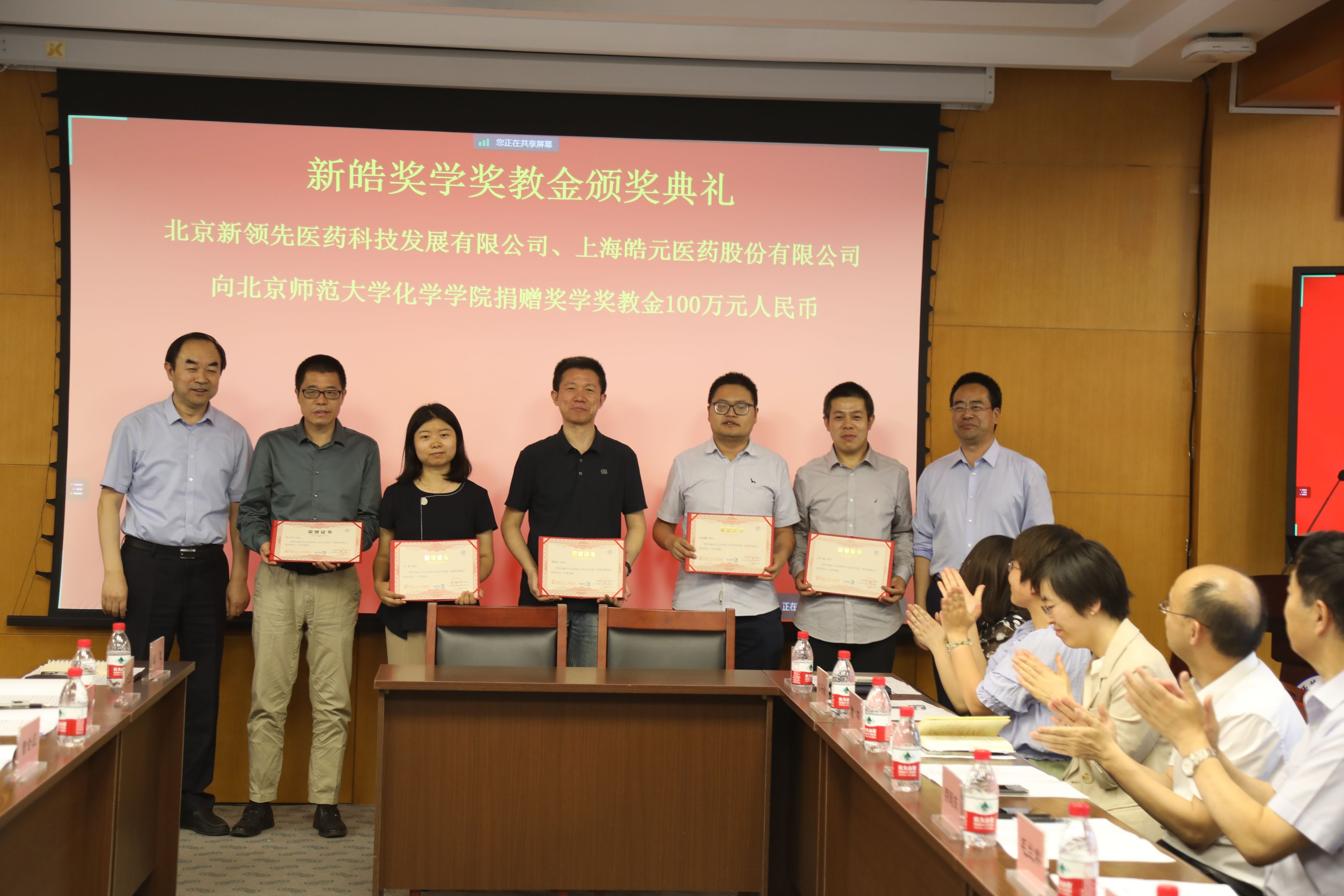 ▲ 新領(lǐng)先醫(yī)藥副總裁顏耀東先生、張翔先生;上海皓元首席科學(xué)家、產(chǎn)品負(fù)責(zé)人陳委先生,北區(qū)科研市場銷售主管吳遙女士;北師大化學(xué)學(xué)院黨委書記盧忠林教授、化學(xué)學(xué)院院長毛蘭群教授分別為獲獎師生們頒獎