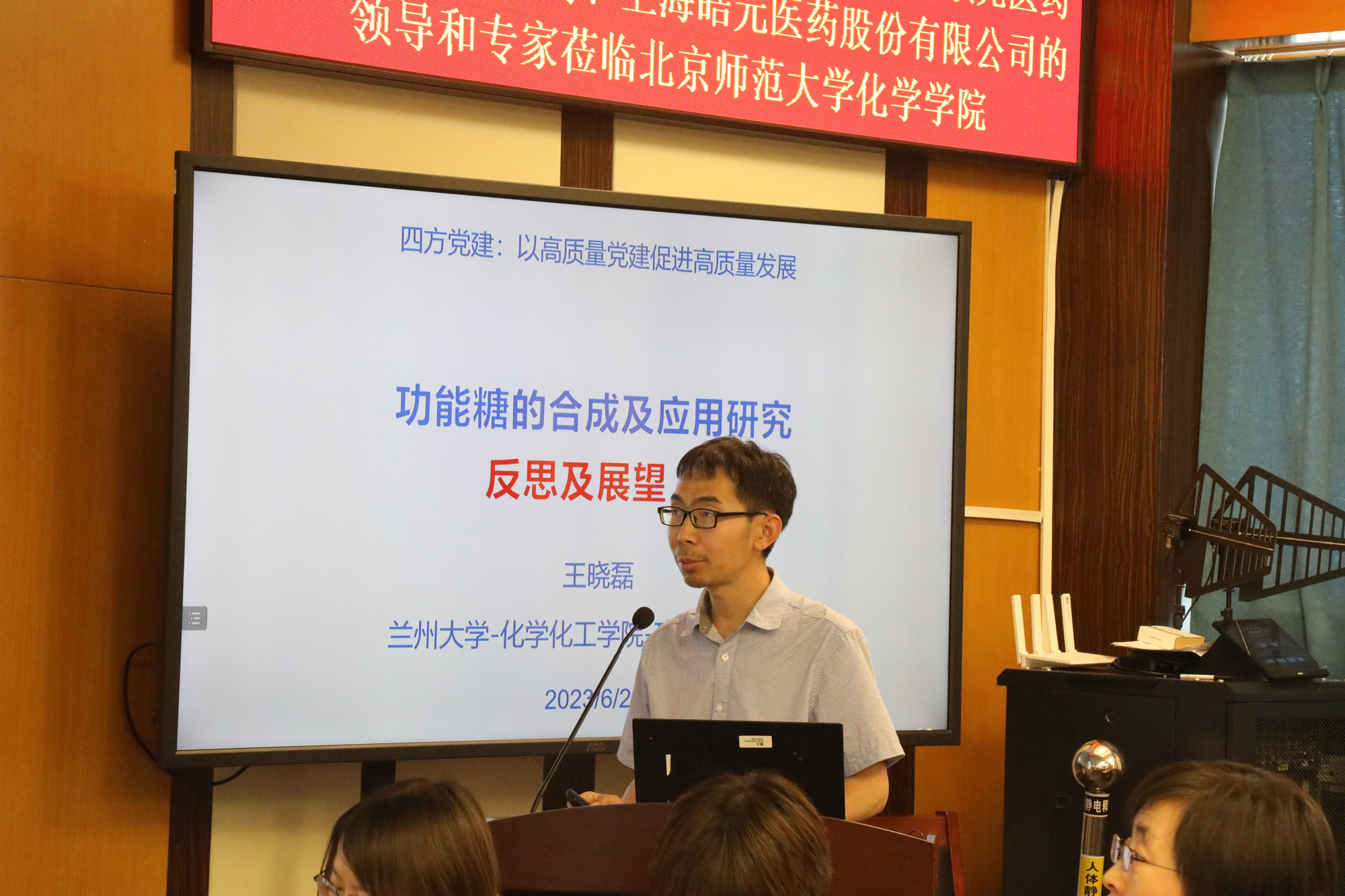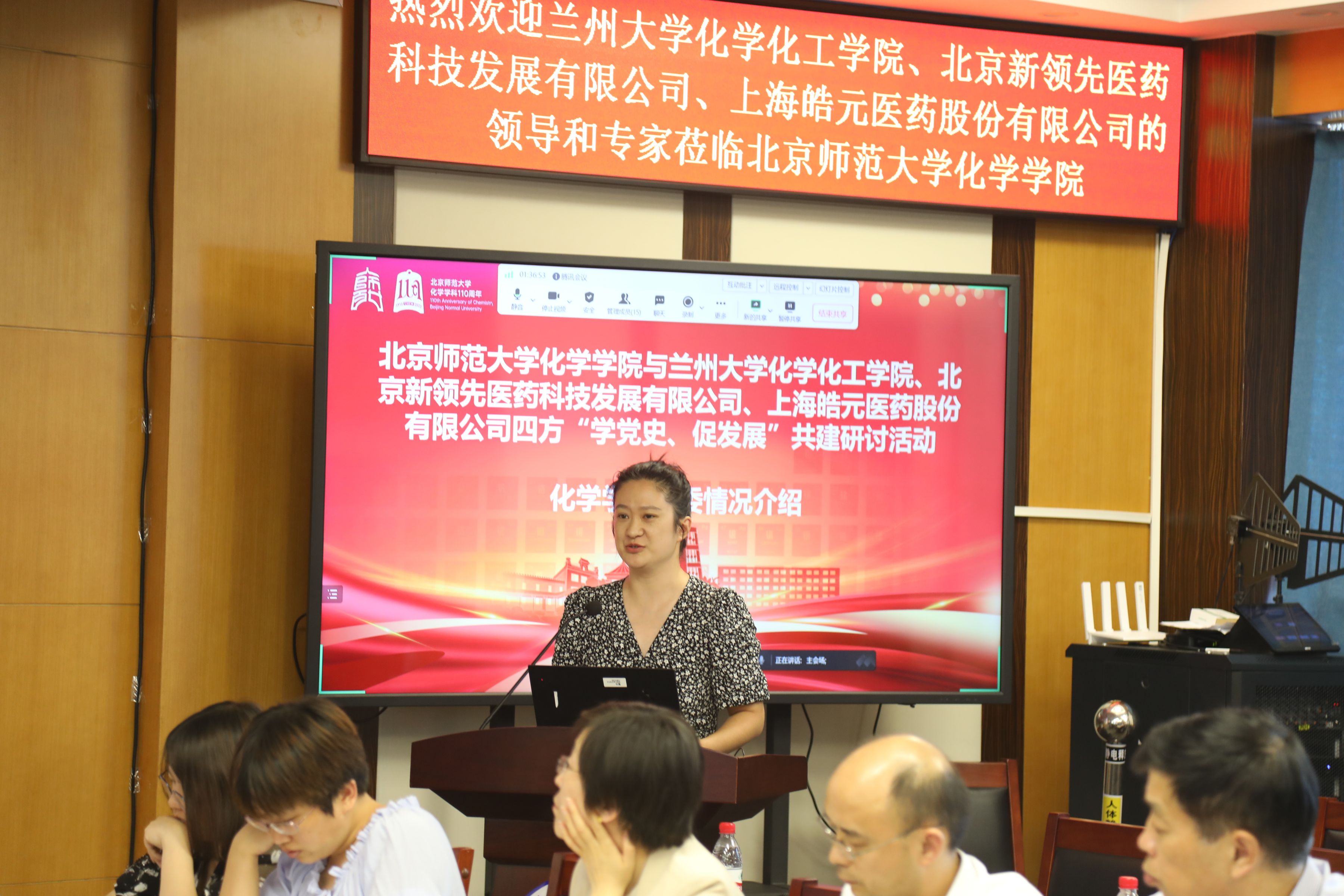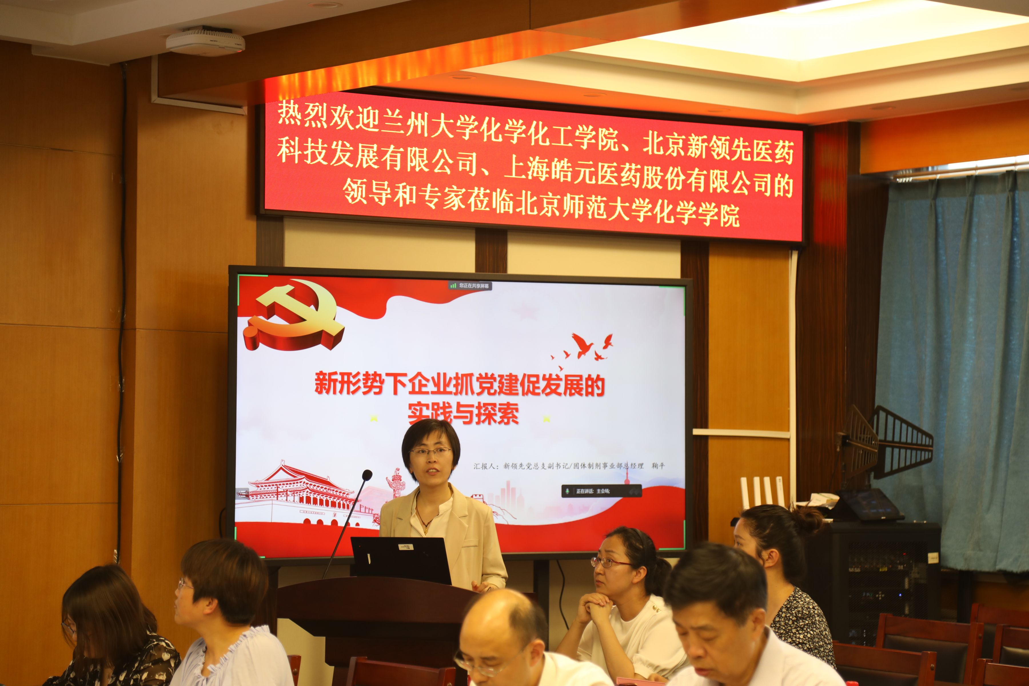▲ 新領(lǐng)先醫(yī)藥黨總支副書記、固體制劑事業(yè)部總經(jīng)理鞠平女士,蘭州大學(xué)化學(xué)化工學(xué)院丁三元教授,北師大化學(xué)學(xué)院黨委辦公室主任、團(tuán)委書記徐娜女士分別作黨建工作匯報(bào)