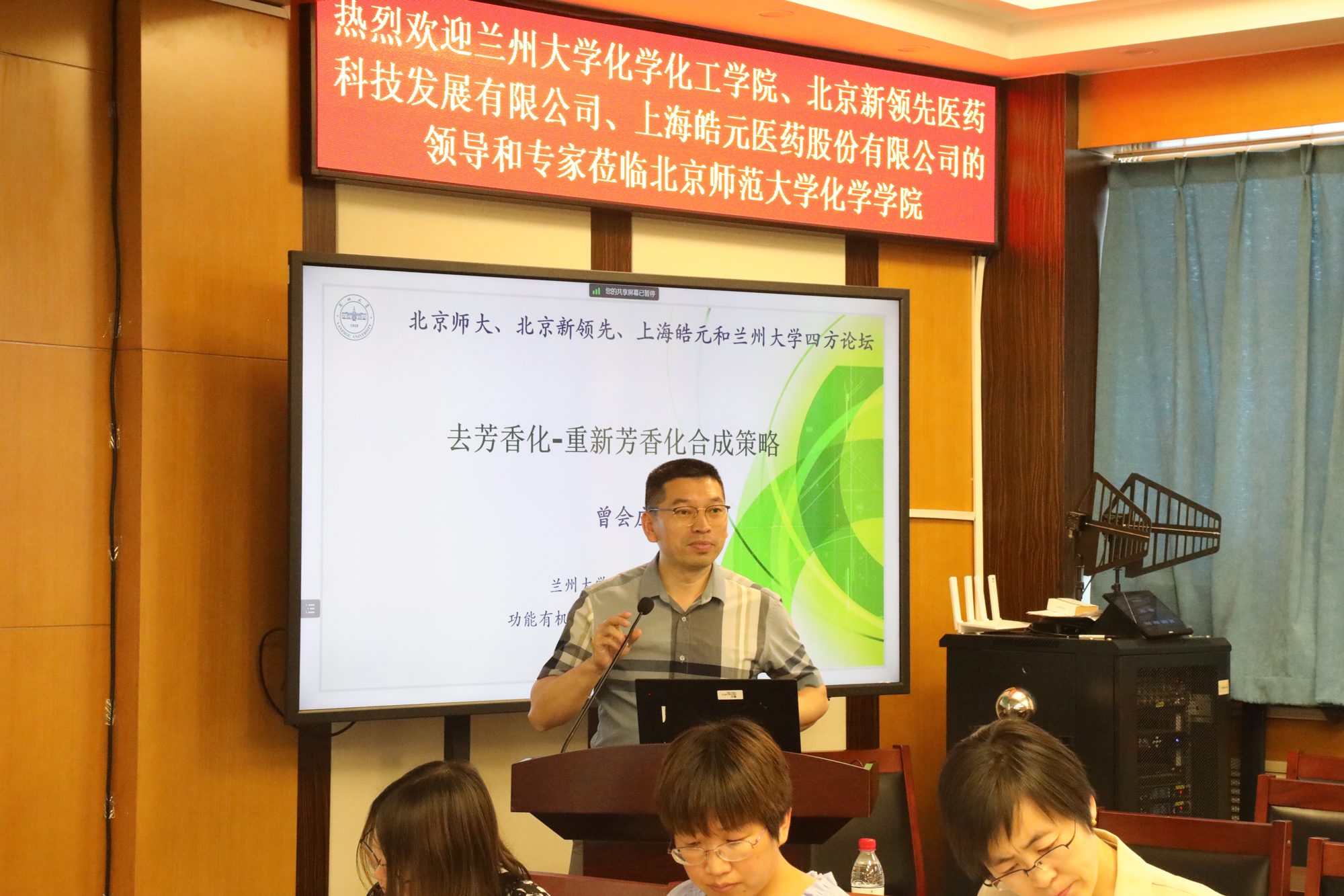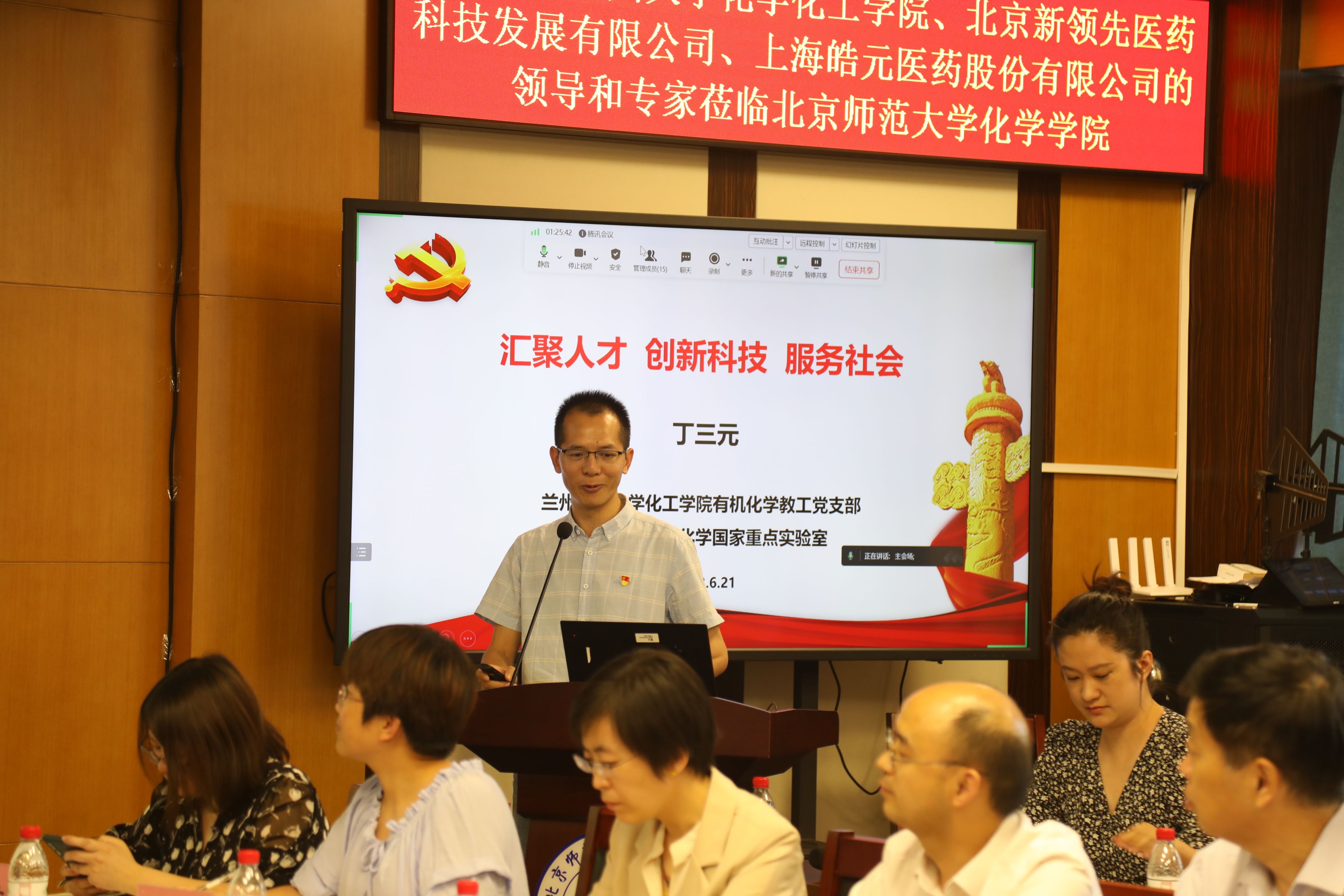 參加本次研討活動的有:北京師范大學(xué)化學(xué)學(xué)院黨委書記盧忠林教授,化學(xué)學(xué)院院長毛蘭群教授,化學(xué)學(xué)院黨委副書記韓娟博士,科研院校地合作與科研成果轉(zhuǎn)化處副處長孫根班教授;蘭州大學(xué)化學(xué)化工學(xué)院黨委書記杜生一博士,功能有機(jī)分子化學(xué)國家重點(diǎn)實(shí)驗(yàn)室主任王為教授(線上);新領(lǐng)先醫(yī)藥黨總支書記、董事長陶新華先生,副總裁顏耀東先生、張翔先生,黨總支副書記、固體制劑事業(yè)部總經(jīng)理鞠平女士,黨總支紀(jì)支檢委員、臨床運(yùn)營部副總監(jiān)杜書青女士;上海皓元產(chǎn)品負(fù)責(zé)人、樂研首席科學(xué)家陳委先生等30余人。