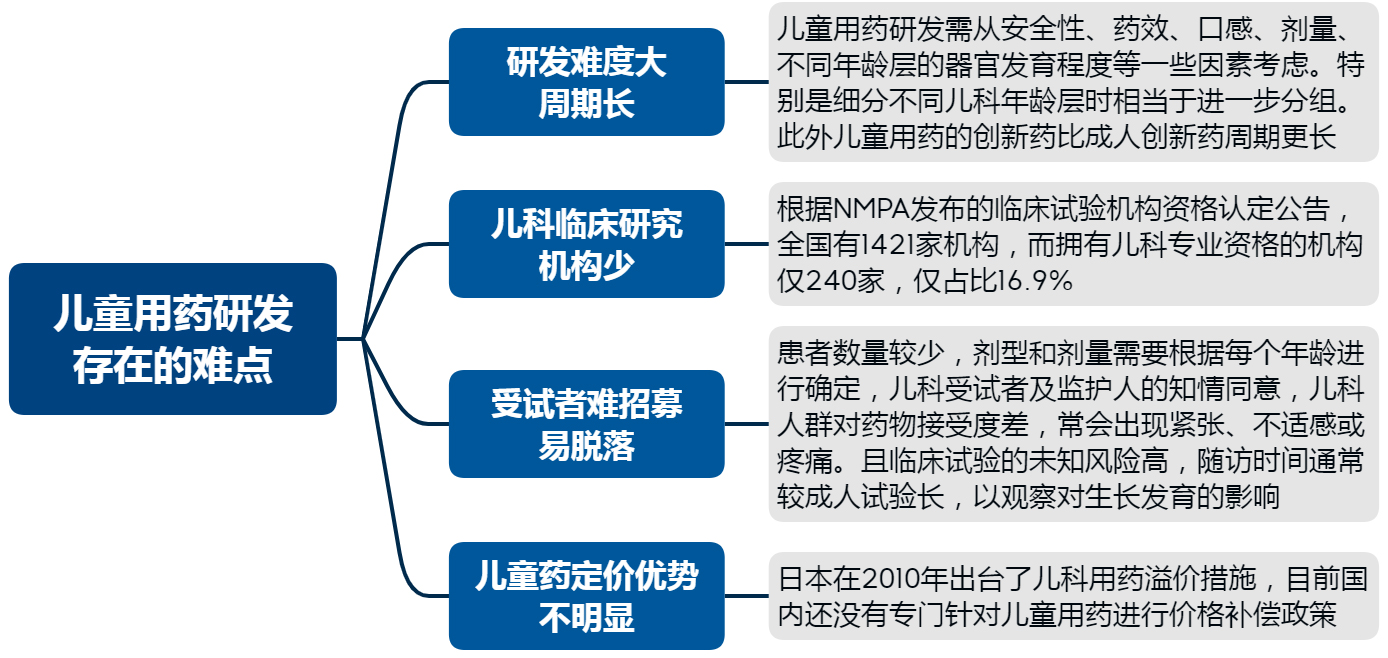 兒童用藥呈現“四少三高”的局面:品種少、劑型少、規(guī)格少、特藥少,用藥風險高、不良反應高、資源浪費高。造成這個現狀的原因一是研發(fā)難度大、研發(fā)周期長;二是兒童專業(yè)研發(fā)機構比較少;三是試驗受試者難招募、易脫落;四是定價優(yōu)勢不明顯,市場推廣難度大。目前國家已經推出相應政策和指導原則(如技術端:對兒童專用藥,自該適應癥首次在中國獲批之日起給予6年數據保護期以及12個月市場獨占期;審評審批端:兒童藥優(yōu)先審評審批并明確為第一優(yōu)先級別;市場端:放寬醫(yī)療機構兒童藥品“一品兩規(guī)”限制、優(yōu)先納入國家醫(yī)保、國家基本藥物目錄等),以指導和鼓勵企業(yè)研發(fā)兒童用藥,促進或推動兒童藥物可及,滿足兒童臨床用藥需求。