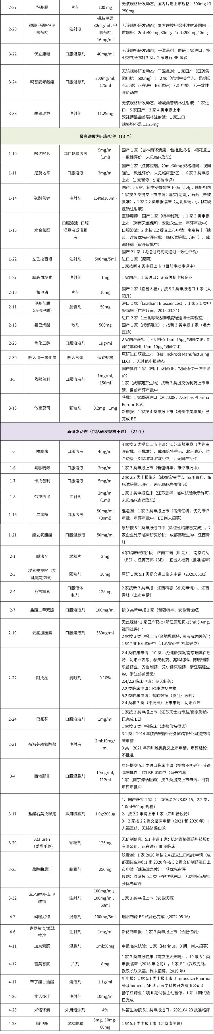 將鼓勵兒童用藥清單中化藥的國內研發(fā)情況進行梳理,其中40個化藥已有公開研發(fā)動態(tài)(35.09%),13個品種已獲批件(11.40%)、27個品種處于臨床或申報階段。企業(yè)研發(fā)熱度較高的品種有碳酸氫鈉注射液、左乙拉西坦注射液、阿托品滴眼液、呋塞米口服溶液、胍法辛緩釋片等。清單中65%以上的化藥(約74個品規(guī))暫無企業(yè)申報或者公開研發(fā)動態(tài),對于擬布局兒童藥物市場的企業(yè),還有很多的選擇空間。