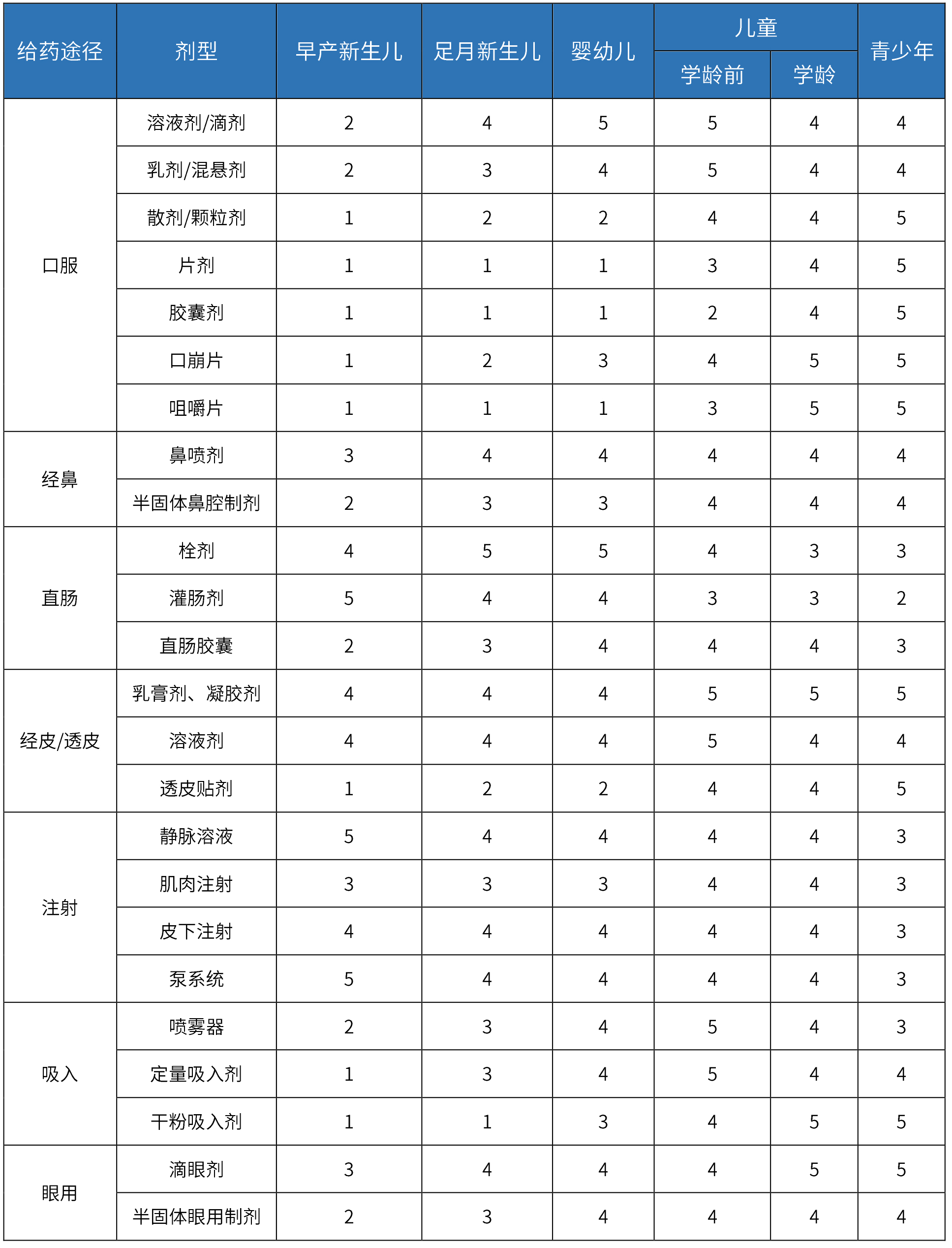 顆粒劑、散劑、口服溶液、口服混懸液、口服滴劑、口服乳劑、細粒劑、口崩片、口溶膜劑、干混懸劑、咀嚼片、微片、片劑、分散片、膠囊、注射劑等。在2020年發(fā)布的《兒童用藥(化學藥品)藥學開發(fā)指導原則(試行)》中,藥審中心列舉了不同年齡段兒童對于部分給藥途徑和劑型的可接受性調研結果。指標1~5對于低齡兒童主要說明給藥途徑和劑型的適宜性,數值越高,適宜性越高;對于更高年齡的兒童表示對特定劑型的接受程度,數值越高,接受程度越高。