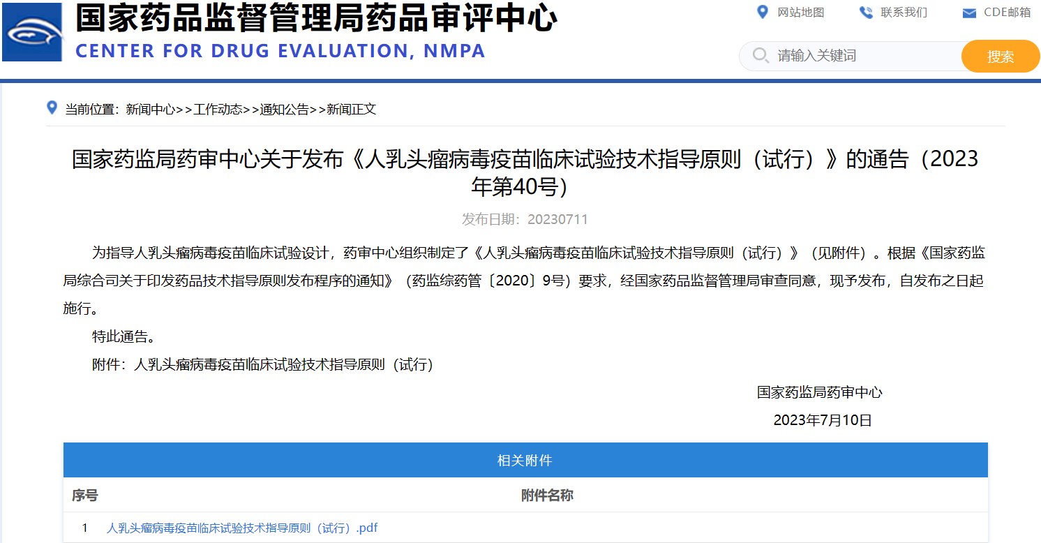 國(guó)家藥監(jiān)局藥審中心關(guān)于發(fā)布《人乳頭瘤病毒疫苗臨床試驗(yàn)技術(shù)指導(dǎo)原則(試行)》的通告(2023年第40號(hào))