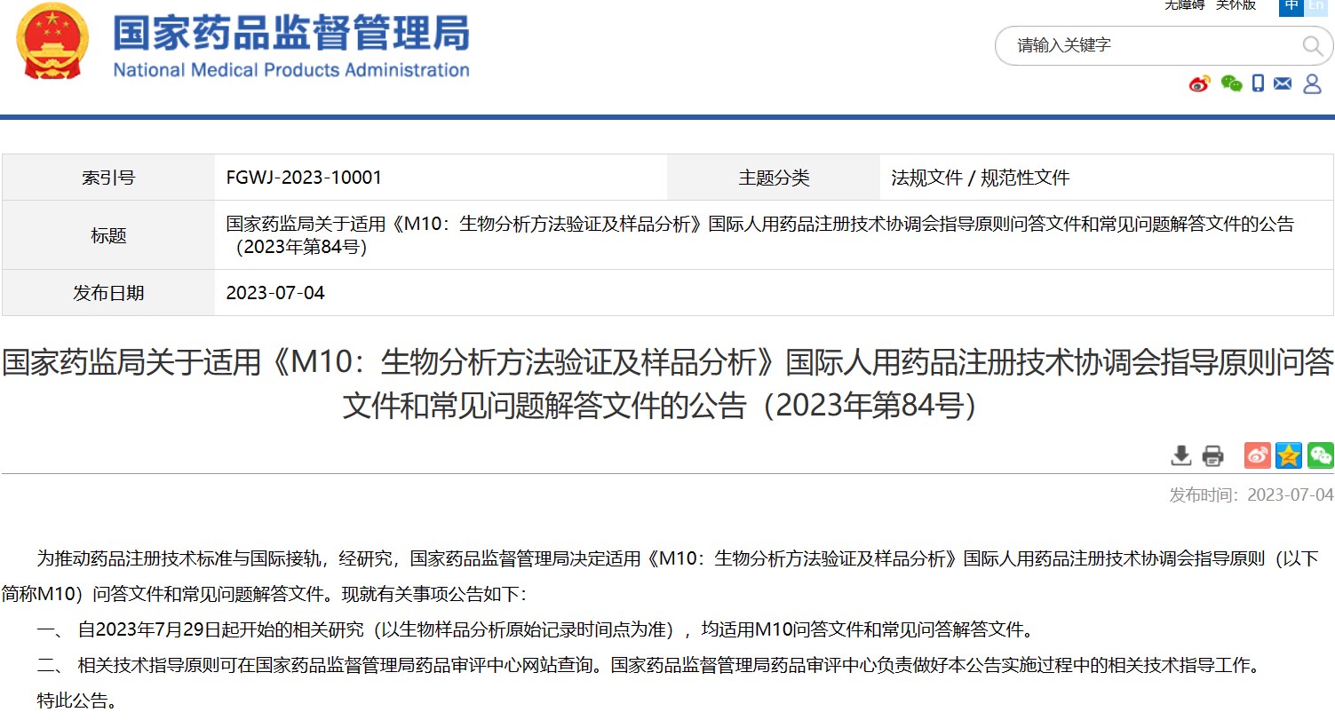 國(guó)家藥監(jiān)局關(guān)于適用《M10:生物分析方法驗(yàn)證及樣品分析》國(guó)際人用藥品注冊(cè)技術(shù)協(xié)調(diào)會(huì)指導(dǎo)原則問答文件和常見問題解答文件的公告(2023年第84號(hào))