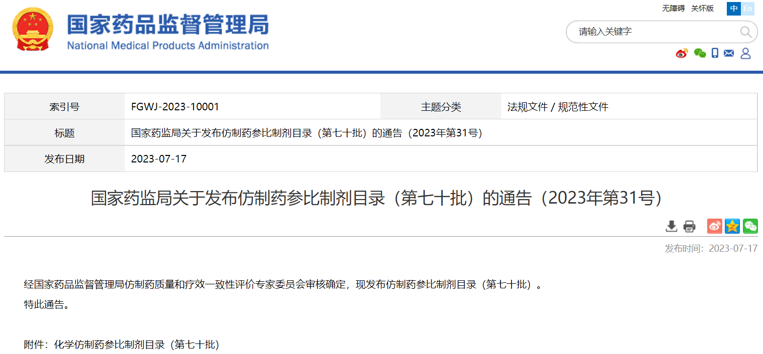 國家藥監(jiān)局關(guān)于發(fā)布仿制藥參比制劑目錄(第七十批)的通告(2023年第31號)