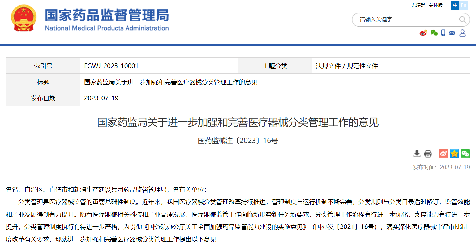 國家藥監(jiān)局關(guān)于進(jìn)一步加強和完善醫(yī)療器械分類管理工作的意見