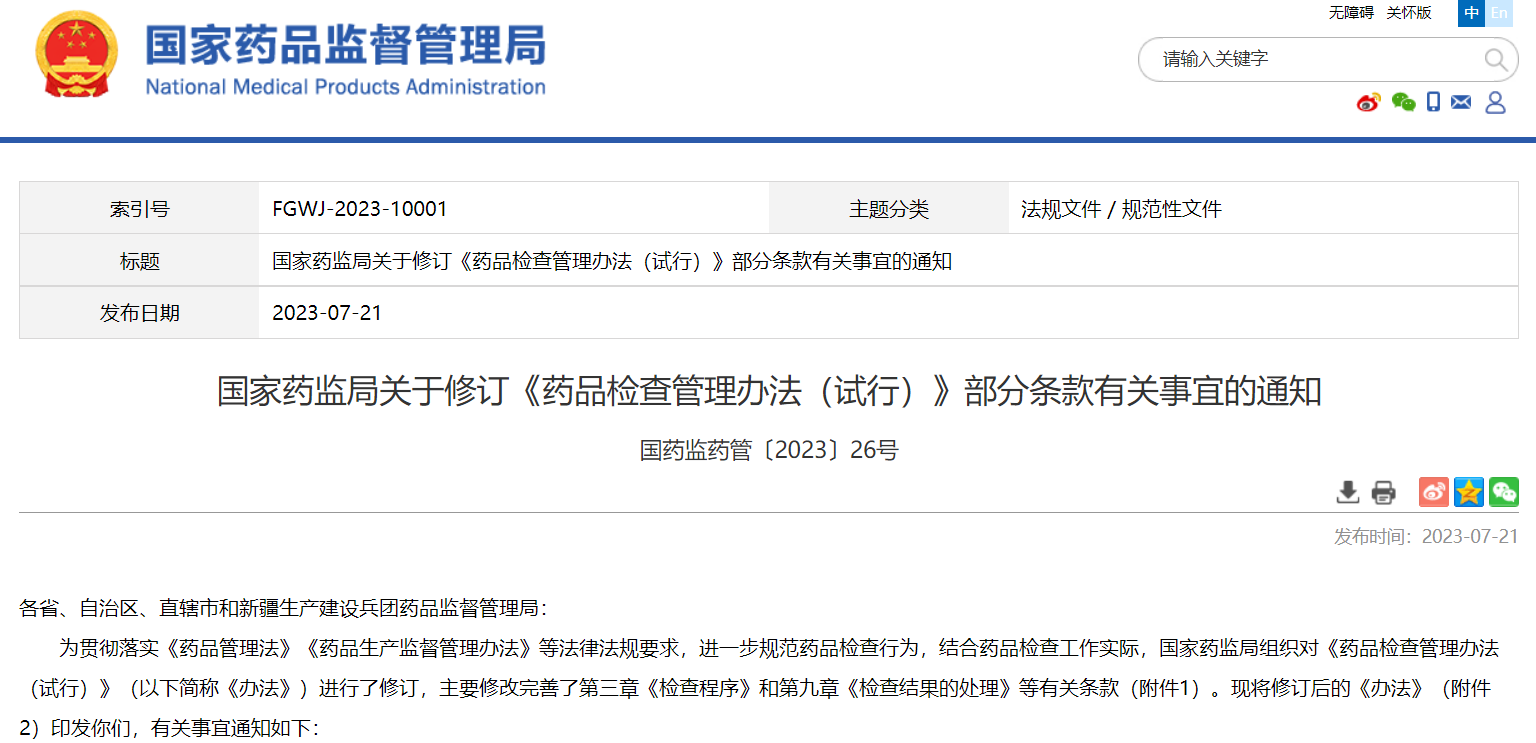 國家藥監(jiān)局關(guān)于修訂《藥品檢查管理辦法(試行)》部分條款有關(guān)事宜的通知