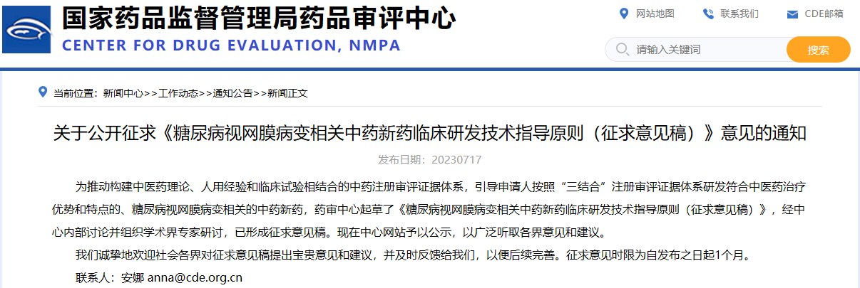 關(guān)于公開征求《糖尿病視網(wǎng)膜病變相關(guān)中藥新藥臨床研發(fā)技術(shù)指導(dǎo)原則(征求意見稿)》意見的通知
