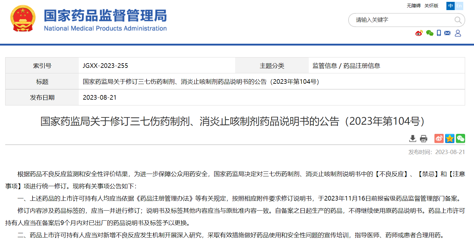 國家藥監(jiān)局關(guān)于修訂三七傷藥制劑、消炎止咳制劑藥品說明書的公告(2023年第104號)