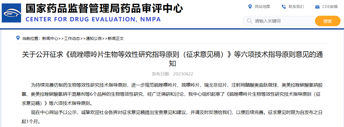 關(guān)于公開征求《硫唑嘌呤片生物等效性研究指導(dǎo)原則(征求意見稿)》等六項(xiàng)技術(shù)指導(dǎo)原則意見的通知