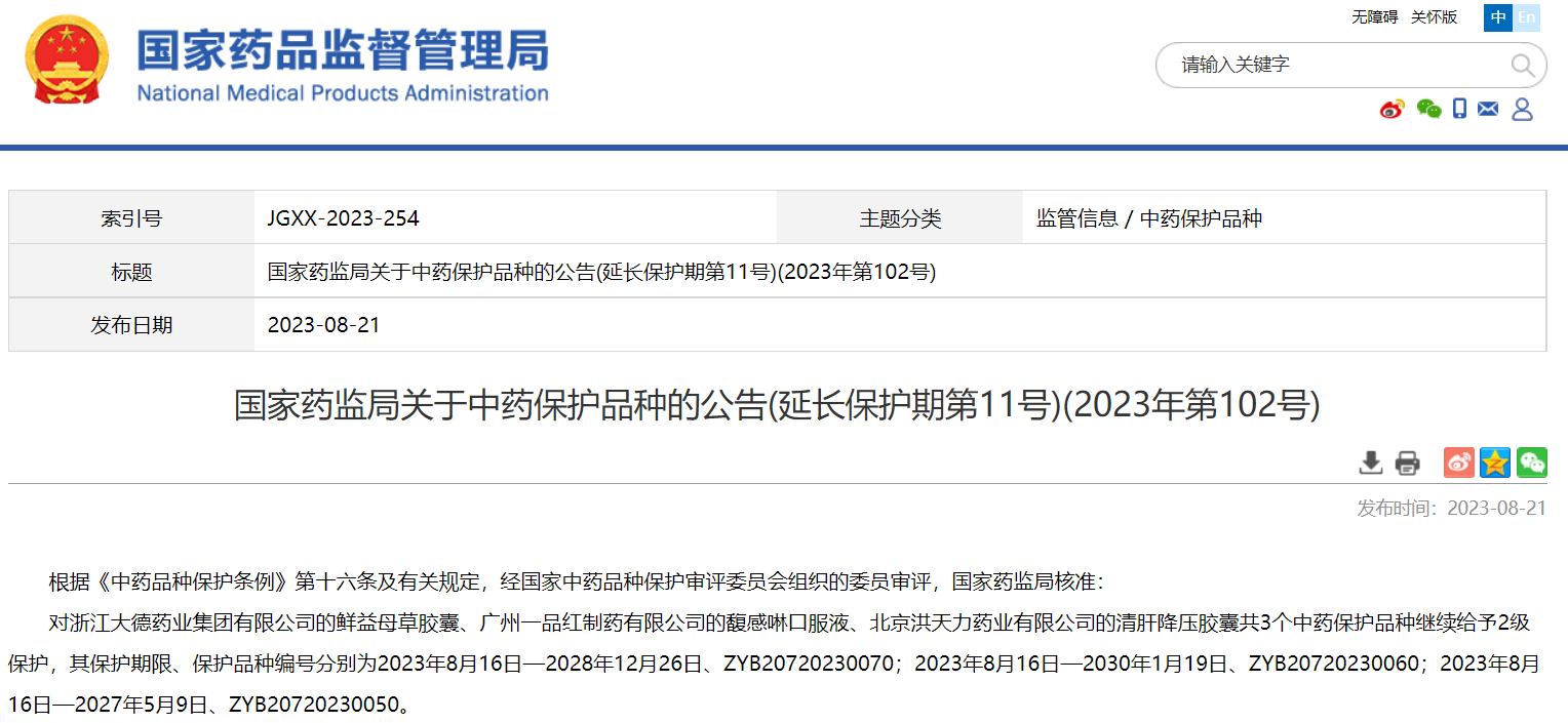 國家藥監(jiān)局關(guān)于中藥保護(hù)品種的公告(延長保護(hù)期第11號)(2023年第102號)