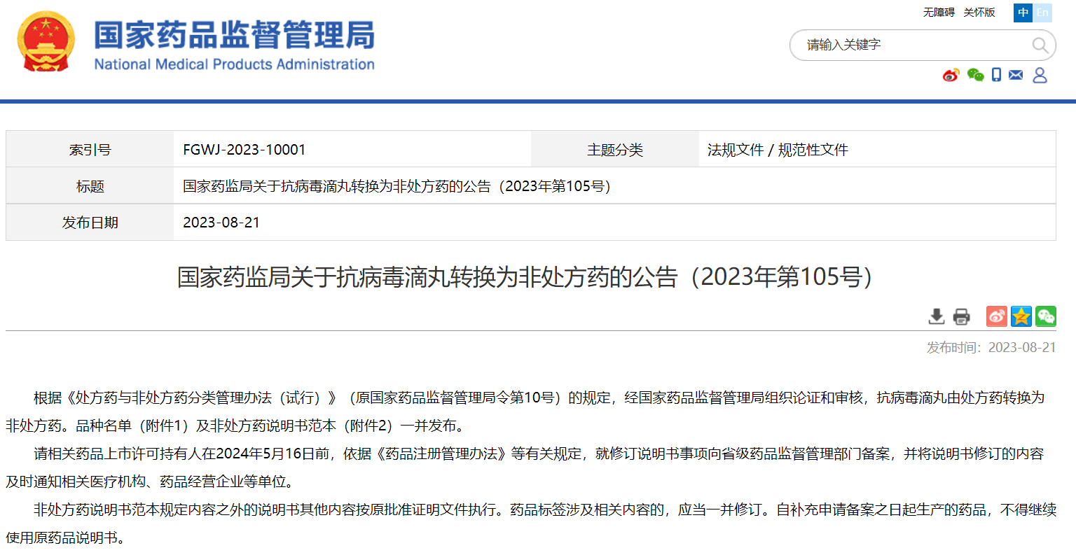 國家藥監(jiān)局關(guān)于抗病毒滴丸轉(zhuǎn)換為非處方藥的公告(2023年第105號)