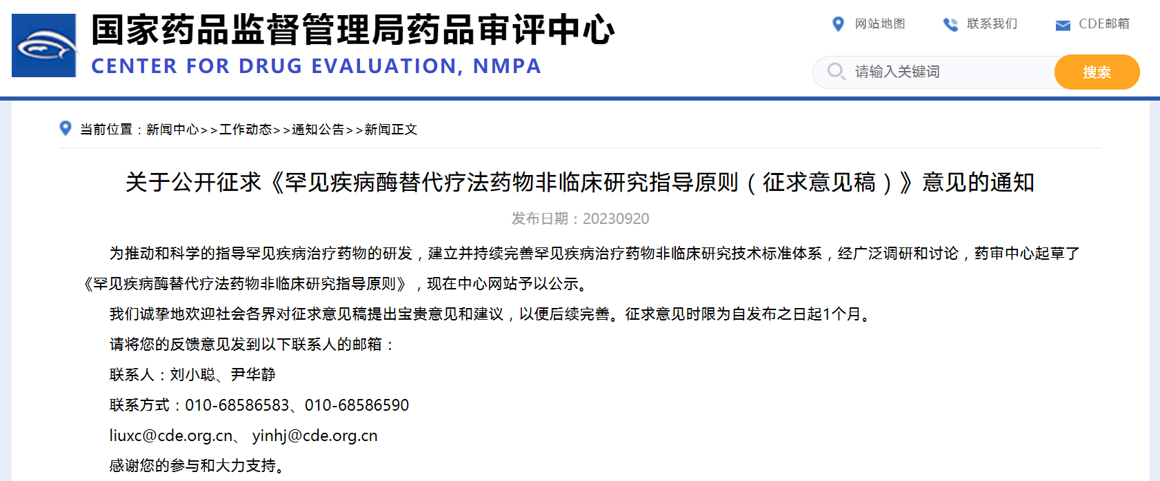 關(guān)于公開征求《罕見疾病酶替代療法藥物非臨床研究指導原則》(征求意見稿)意見的通知