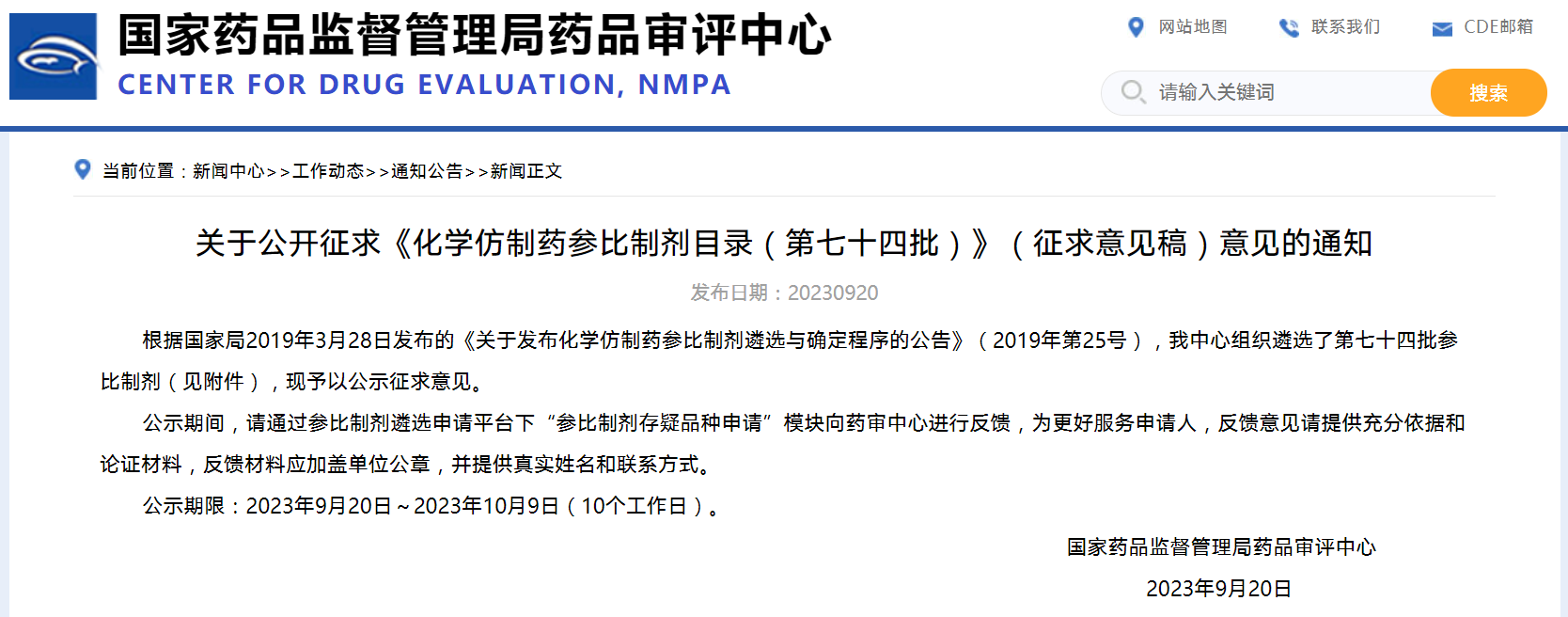 關(guān)于公開征求《化學仿制藥參比制劑目錄(第七十四批)》(征求意見稿)意見的通知