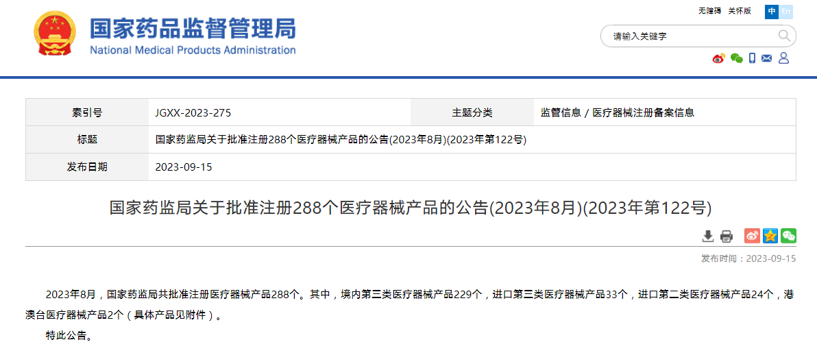 國家藥監(jiān)局關(guān)于批準注冊288個醫(yī)療器械產(chǎn)品的公告(2023年8月)(2023年第122號)