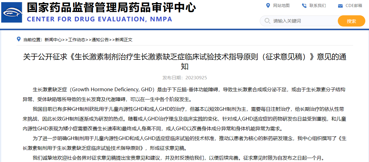 關(guān)于公開征求《生長激素制劑治療生長激素缺乏癥臨床試驗技術(shù)指導(dǎo)原則(征求意見稿)》意見的通知