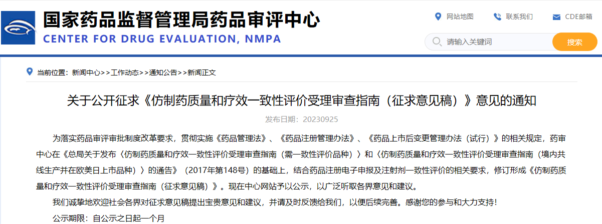 關(guān)于公開征求《仿制藥質(zhì)量和療效一致性評價受理審查指南(征求意見稿)》意見的通知