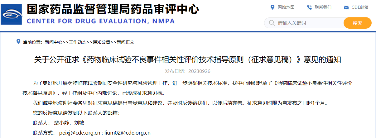關(guān)于公開征求《藥物臨床試驗不良事件相關(guān)性評價技術(shù)指導(dǎo)原則(征求意見稿)》意見的通知