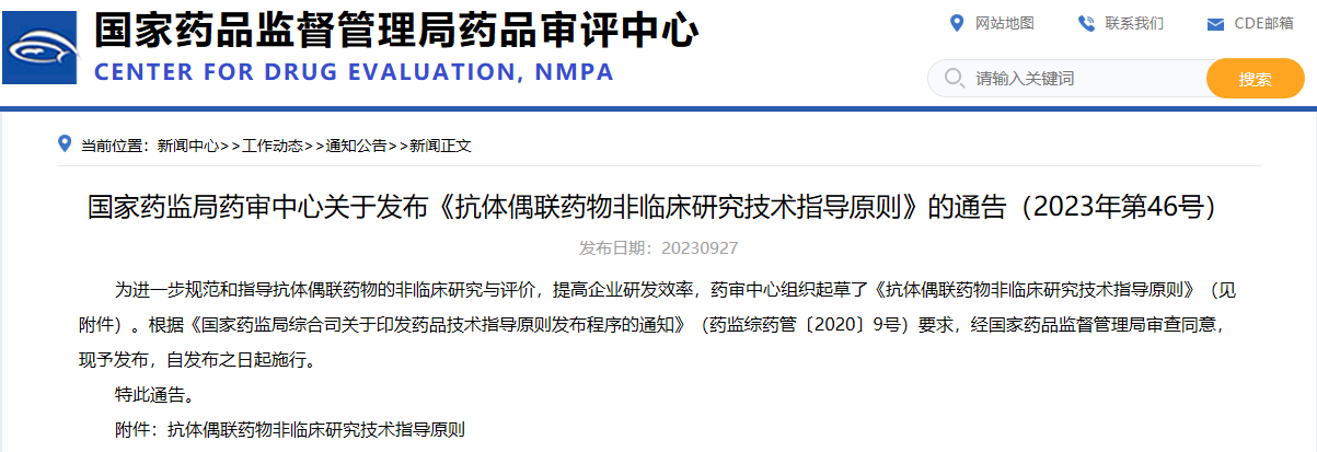 國家藥監(jiān)局藥審中心關(guān)于發(fā)布《抗體偶聯(lián)藥物非臨床研究技術(shù)指導(dǎo)原則》的通告(2023年第46號)
