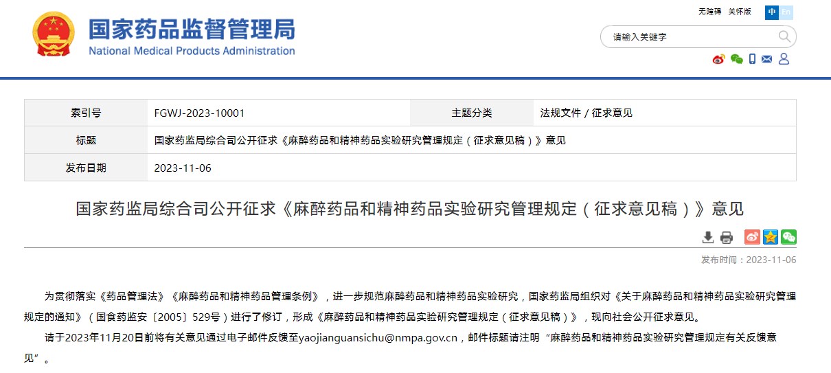 國(guó)家藥監(jiān)局綜合司公開征求《麻醉藥品和精神藥品實(shí)驗(yàn)研究管理規(guī)定(征求意見稿)》意見