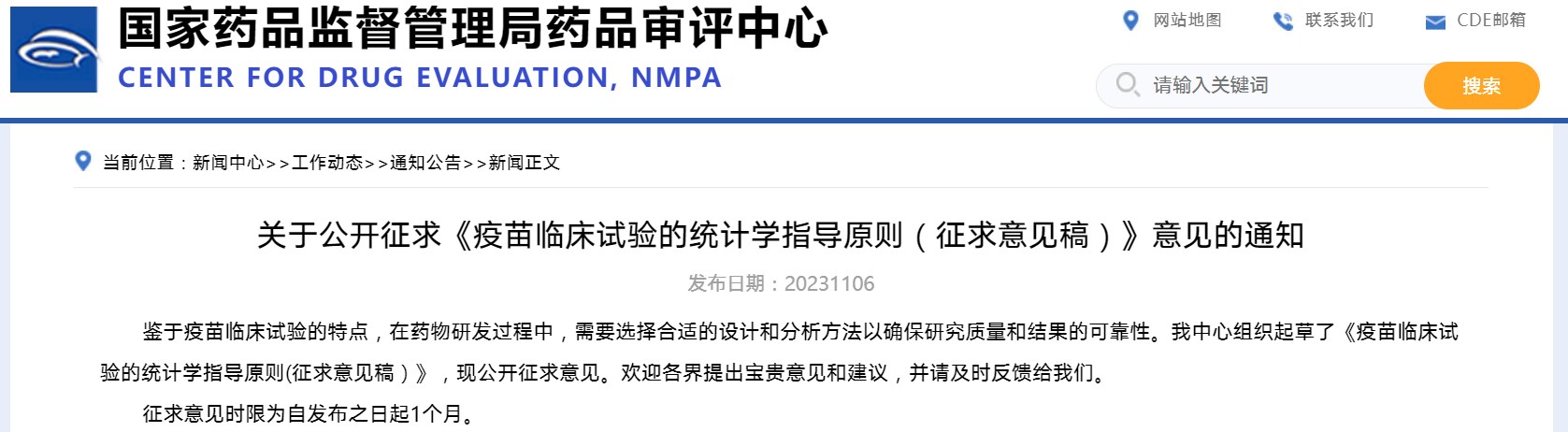 關(guān)于公開征求《疫苗臨床試驗(yàn)的統(tǒng)計(jì)學(xué)指導(dǎo)原則(征求意見稿)》意見的通知