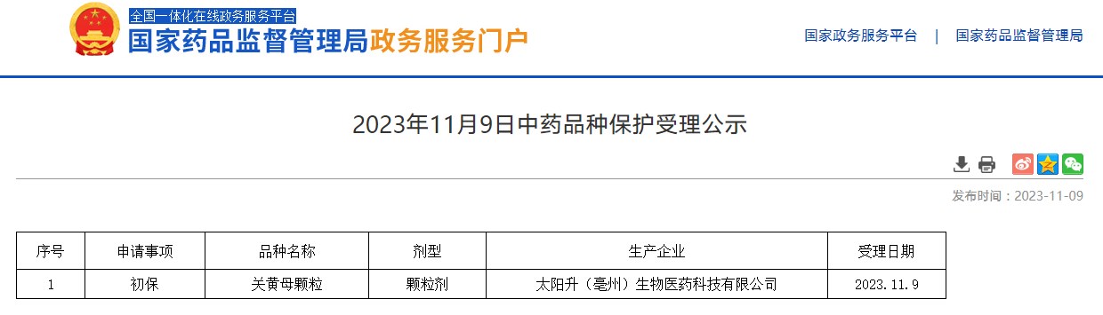 2023年11月9日中藥品種保護(hù)受理公示