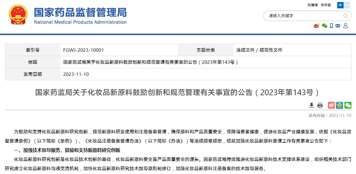 國(guó)家藥監(jiān)局關(guān)于化妝品新原料鼓勵(lì)創(chuàng)新和規(guī)范管理有關(guān)事宜的公告(2023年第143號(hào))