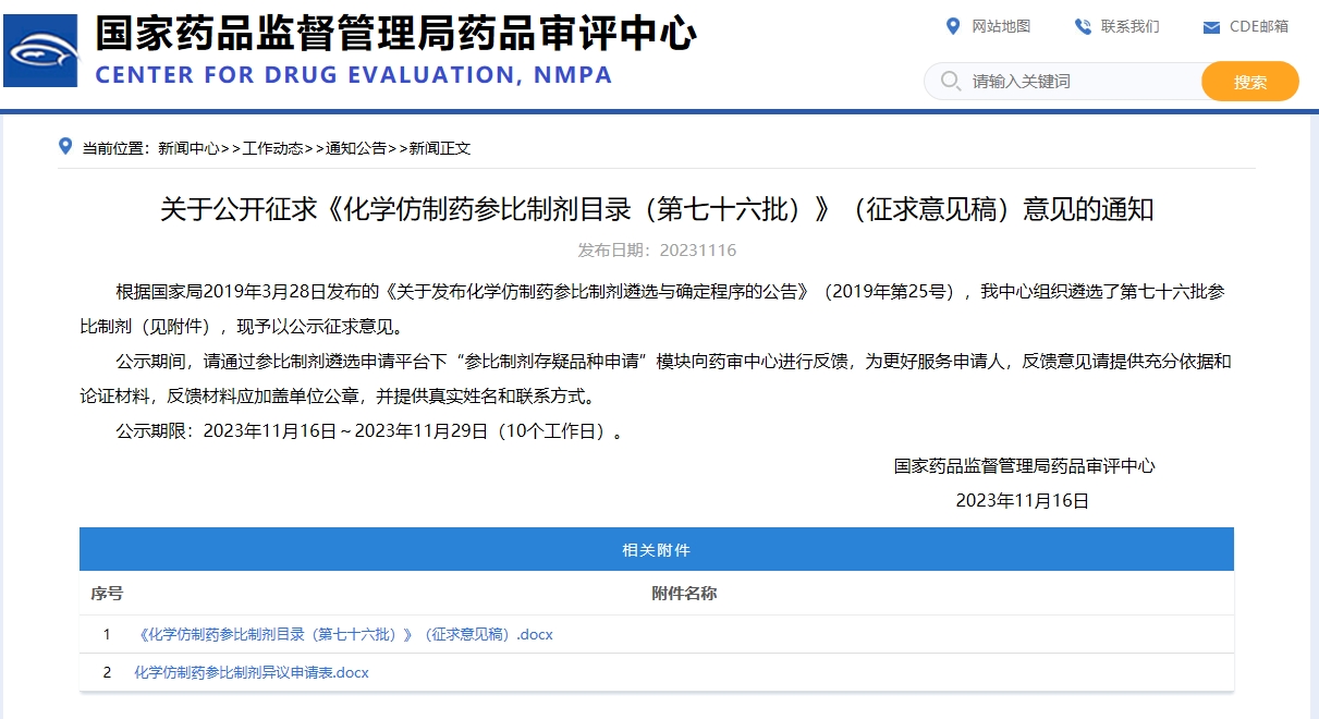 關(guān)于公開征求《化學(xué)仿制藥參比制劑目錄(第七十六批)》(征求意見稿)意見的通知
