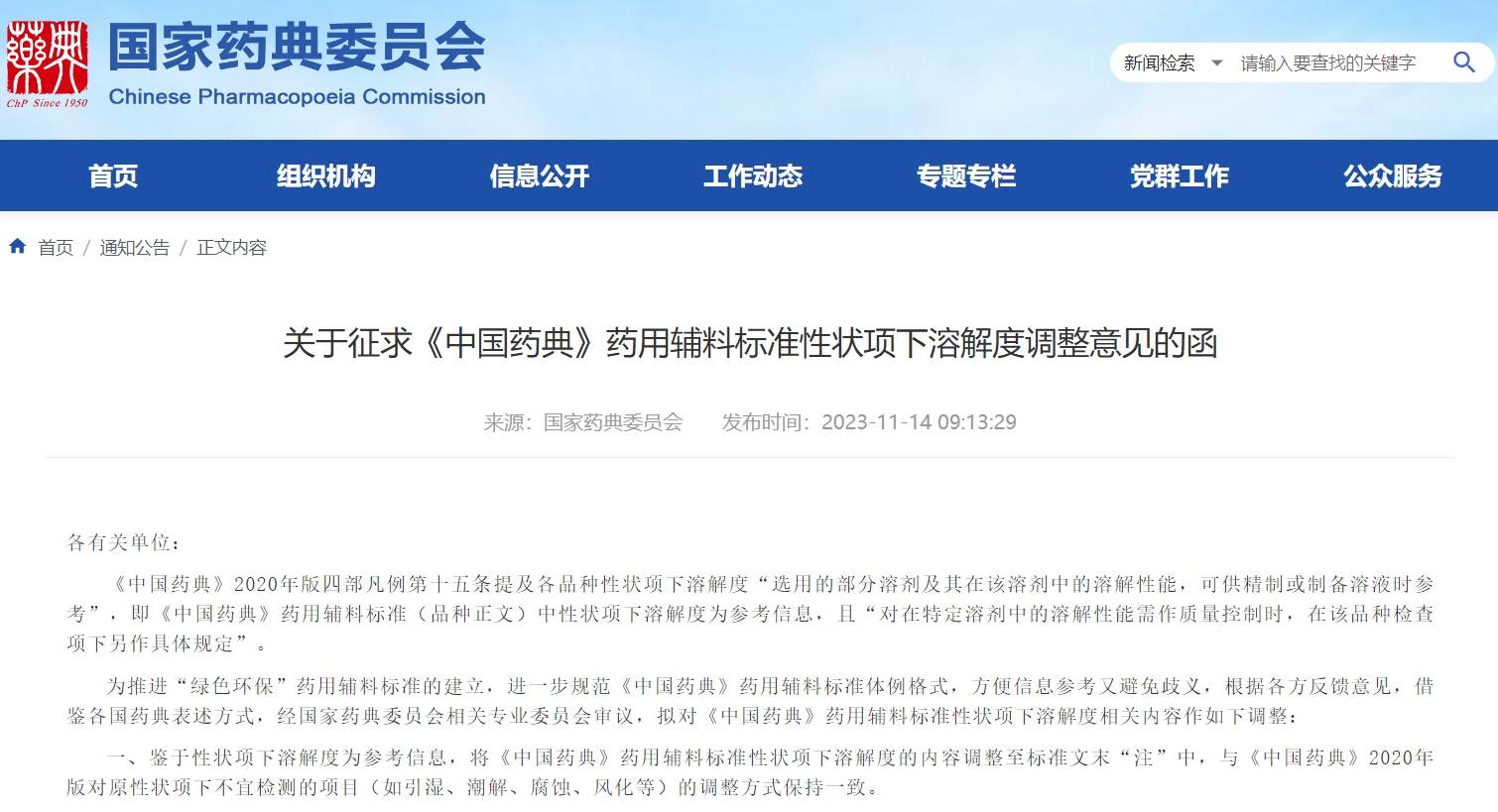 關(guān)于征求《中國(guó)藥典》藥用輔料標(biāo)準(zhǔn)性狀項(xiàng)下溶解度調(diào)整意見的函