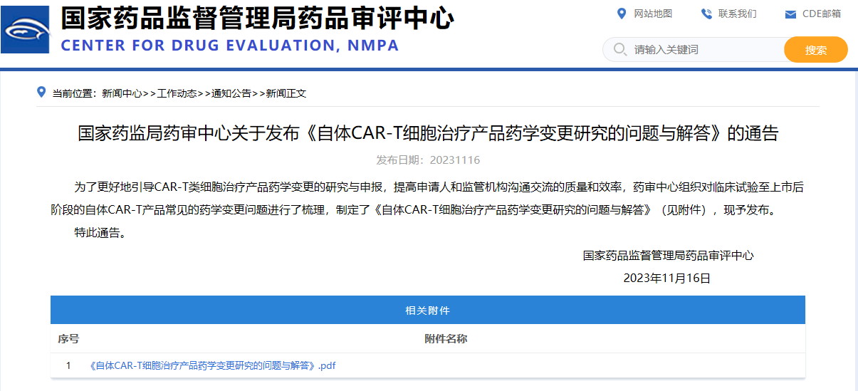 國(guó)家藥監(jiān)局藥審中心關(guān)于發(fā)布《自體CAR-T細(xì)胞治療產(chǎn)品藥學(xué)變更研究的問題與解答》的通告