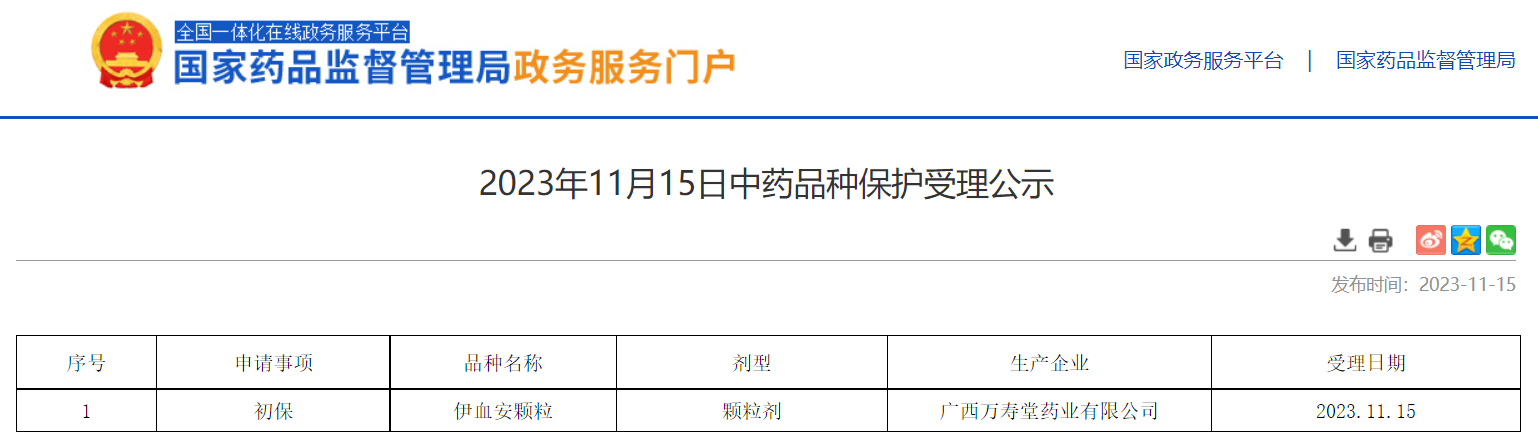 2023年11月15日中藥品種保護(hù)受理公示