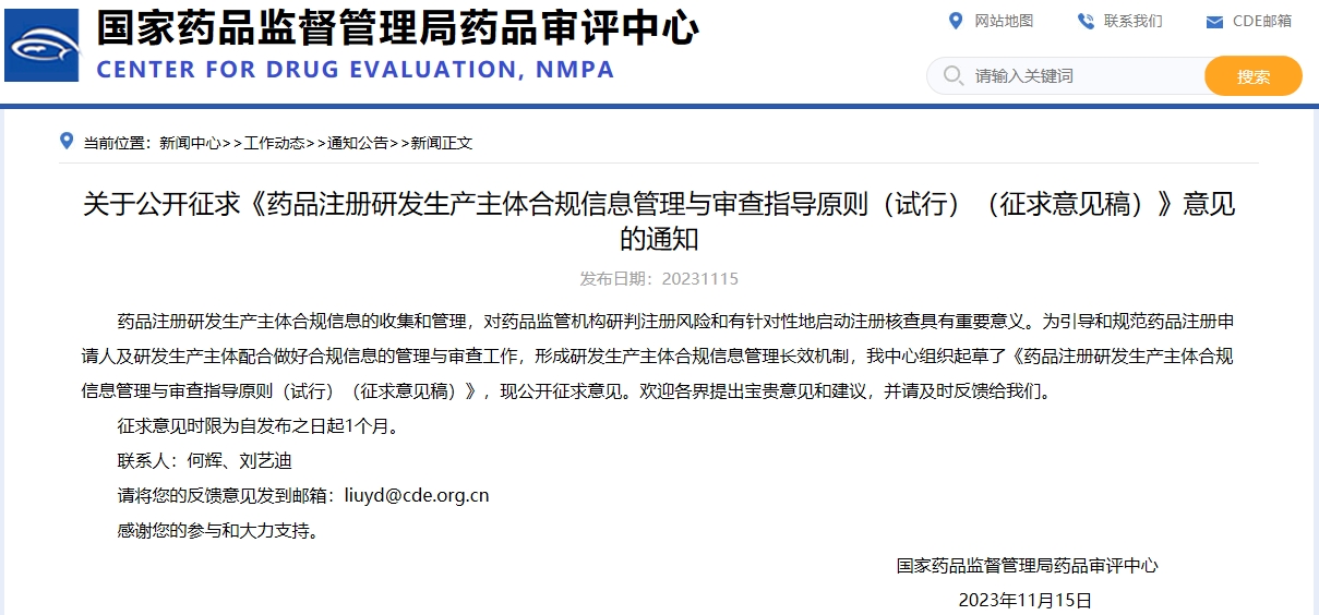 關(guān)于公開征求《藥品注冊(cè)研發(fā)生產(chǎn)主體合規(guī)信息管理與審查指導(dǎo)原則(試行)(征求意見稿)》意見的通知