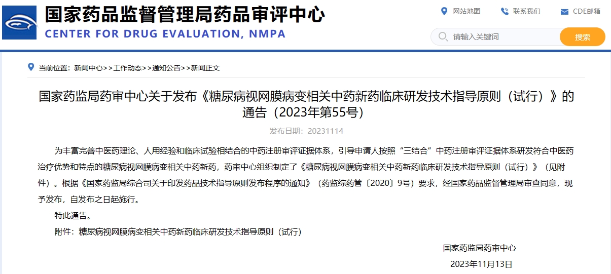 國(guó)家藥監(jiān)局藥審中心關(guān)于發(fā)布《糖尿病視網(wǎng)膜病變相關(guān)中藥新藥臨床研發(fā)技術(shù)指導(dǎo)原則(試行)》的通告(2023年第55號(hào))