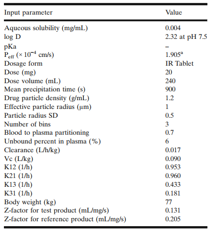對(duì)于預(yù)測(cè)不同晶型的藥動(dòng),需要將不同晶型的數(shù)據(jù)納入至模型中去,如水溶性、FaSSIF和FeSSIF的溶解性和溶出曲線、粒徑等。當(dāng)然我們也有不知道的數(shù)據(jù),如參比制劑的粒徑的數(shù)據(jù),這些數(shù)據(jù)均有可能會(huì)影響藥物在體內(nèi)的吸收,我們決定采用Z-factor模型用于代表不同晶型的體外溶出模型。