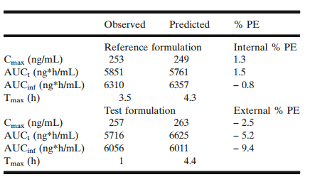 采用參比制劑的PK和體外數(shù)據(jù),建立模型,并采用該模型,進(jìn)行內(nèi)部驗(yàn)證,PE小于10%,符合FDA的指導(dǎo)原則。根據(jù)該原則,可以建立IVIVC。采用IVIVC模型,模擬每個(gè)處方,要求模擬的結(jié)果和實(shí)測(cè)值的PE不超過(guò)15%,該模型可以用于模擬仿制藥的血藥濃度。