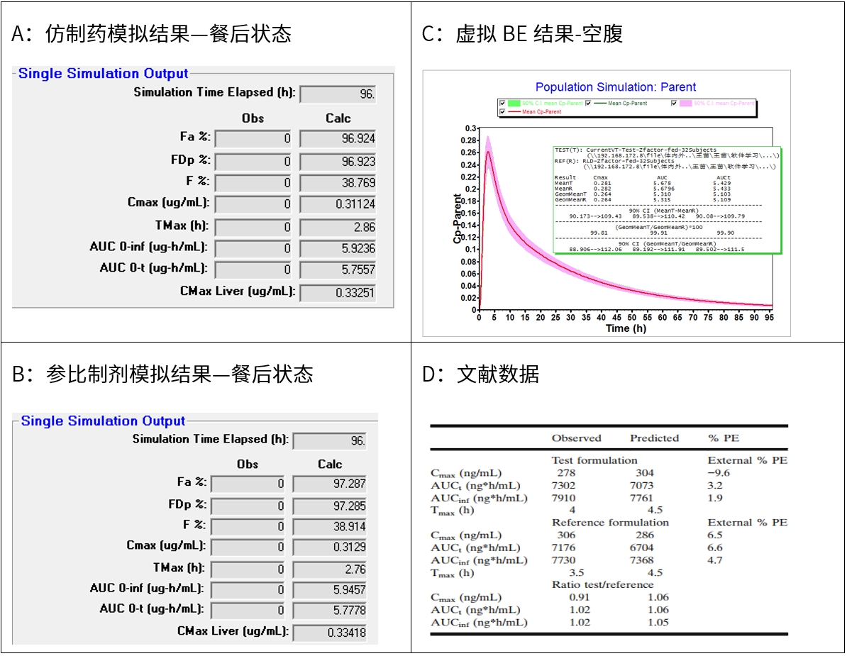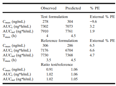 采用上述模型,32例受試者進(jìn)行虛擬BE試驗(yàn),仿制藥和參比制劑的Cmax和AUC均為80.00%-125.00%范圍內(nèi),兩者具有生物等效性。外部驗(yàn)證的模型PE值小于10%。