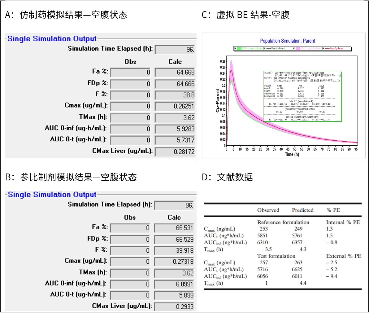 新領(lǐng)先參考文獻(xiàn)值進(jìn)行建模和模擬兩個(gè)制劑的PK參數(shù),Cmax和AUC采用單位分別為ug/ml和ug*h/ml,而文獻(xiàn)中兩個(gè)參數(shù)采用的單位分別為ng/ml和ng*h/ml,無(wú)論空腹和餐后,新領(lǐng)先預(yù)測(cè)Cmax和AUC與文獻(xiàn)值報(bào)道無(wú)顯著性差異。
