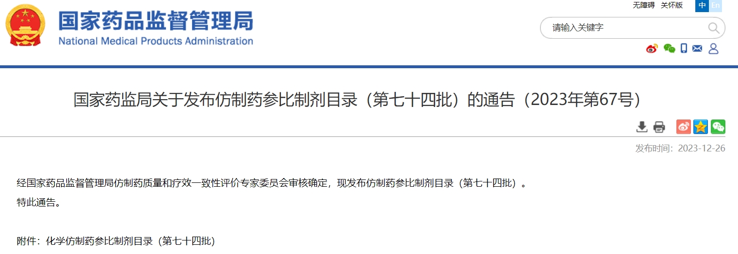 國家藥監(jiān)局關(guān)于發(fā)布仿制藥參比制劑目錄(第七十四批)的通告(2023年第67號(hào))