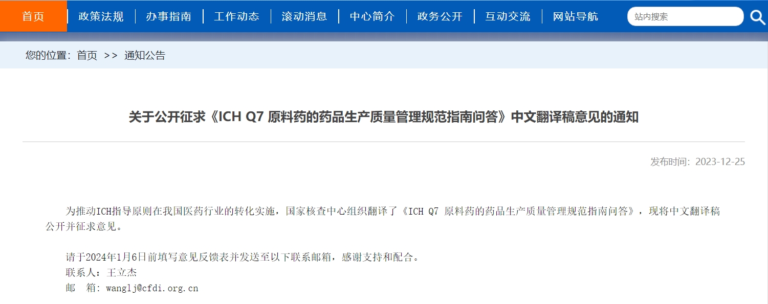 關(guān)于公開征求《ICH Q7 原料藥的藥品生產(chǎn)質(zhì)量管理規(guī)范指南問答》中文翻譯稿意見的通知