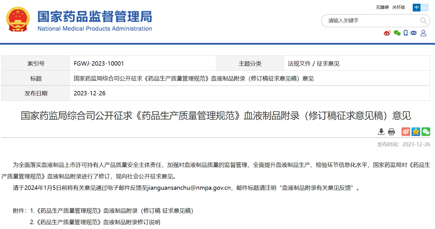 國家藥監(jiān)局綜合司公開征求《藥品生產(chǎn)質(zhì)量管理規(guī)范》血液制品附錄(修訂稿征求意見稿)意見