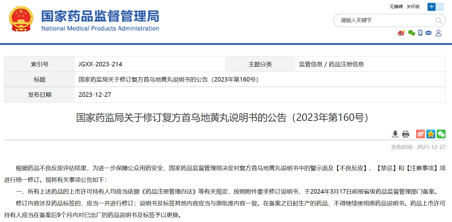 國家藥監(jiān)局關(guān)于修訂復(fù)方首烏地黃丸說明書的公告(2023年第160號(hào))