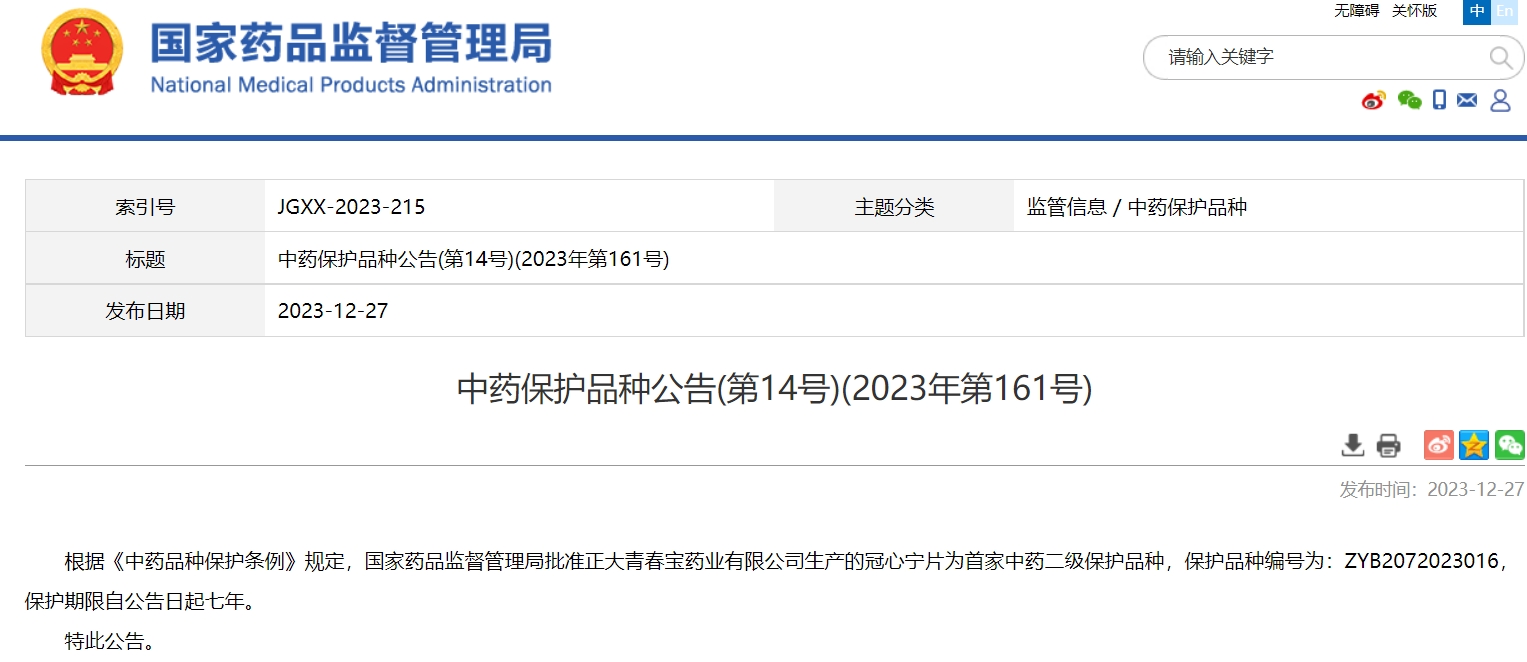 中藥保護(hù)品種公告(第14號(hào))(2023年第161號(hào))