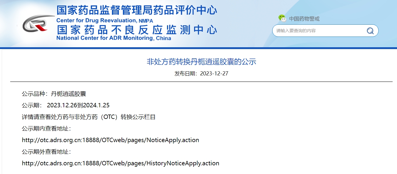 非處方藥轉(zhuǎn)換丹梔逍遙膠囊的公示
