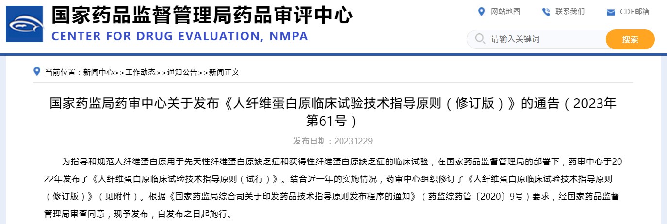 國家藥監(jiān)局藥審中心關(guān)于發(fā)布《人纖維蛋白原臨床試驗(yàn)技術(shù)指導(dǎo)原則(修訂版)》的通告(2023年第61號(hào))