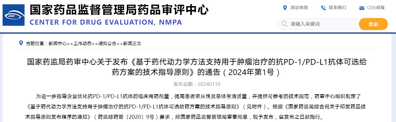 國家藥監(jiān)局藥審中心關(guān)于發(fā)布《基于藥代動(dòng)力學(xué)方法支持用于腫瘤治療的抗PD-1/PD-L1抗體可選給藥方案的技術(shù)指導(dǎo)原則》的通告(2024年第1號(hào))